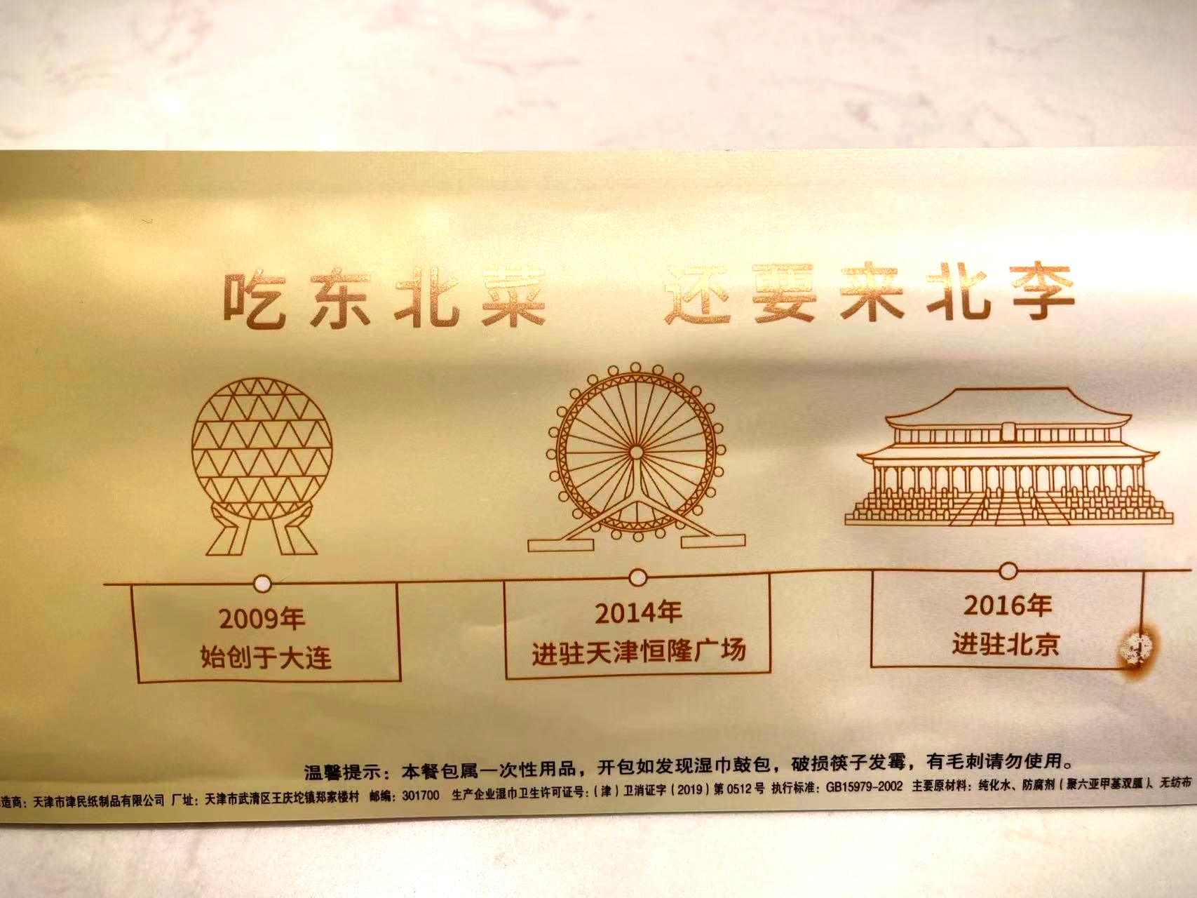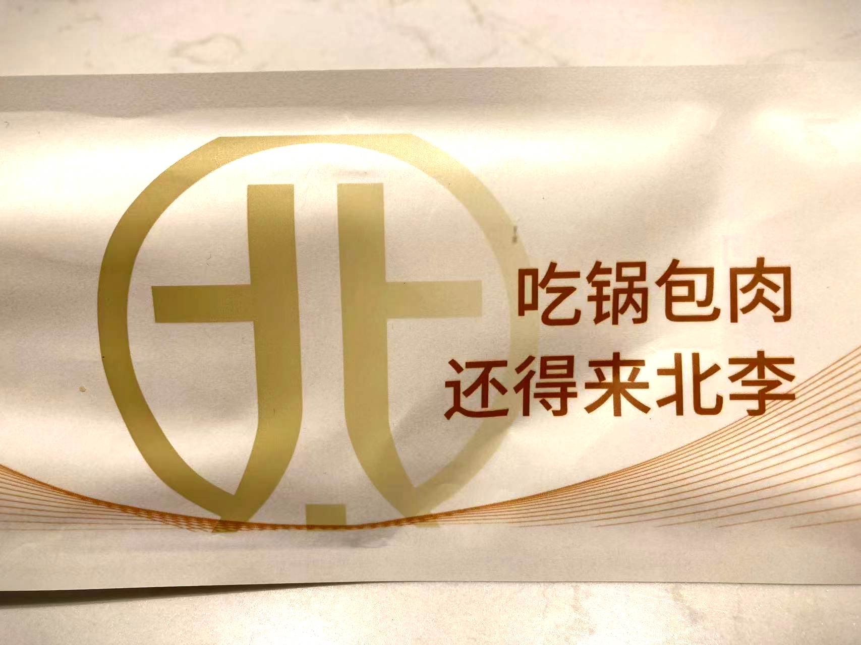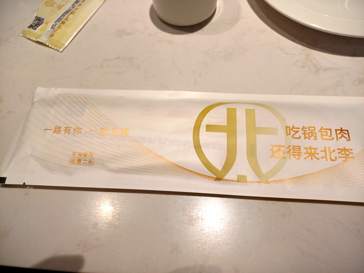 자리를 잡고 먼저 나온 차를 마시며 일회용 식기 포장에 적혀 있는 내용들을 살펴봤는데, 역시나 궈바로우를 먹으려면 베이리에 와야 한다고 적혀 있다.