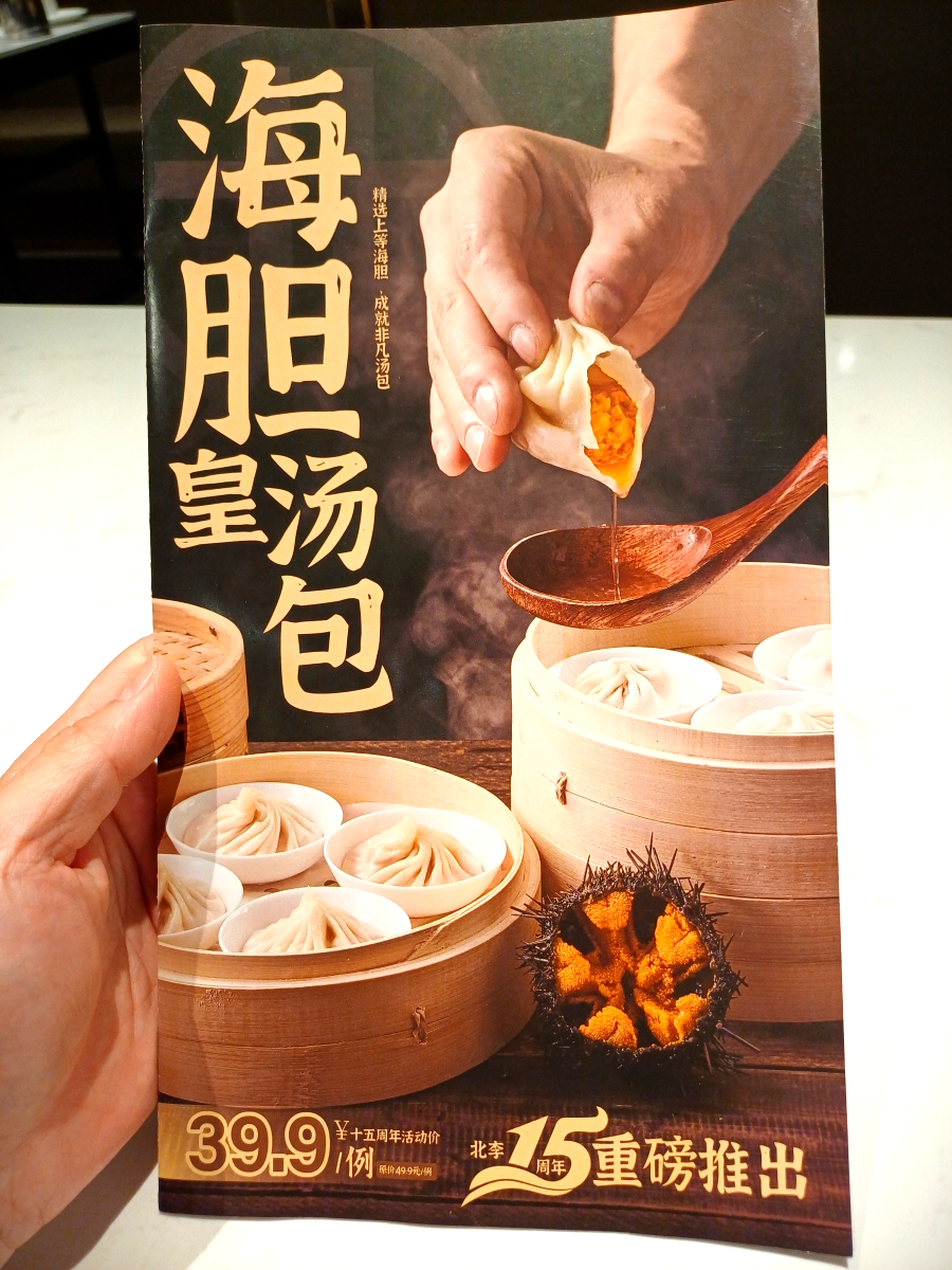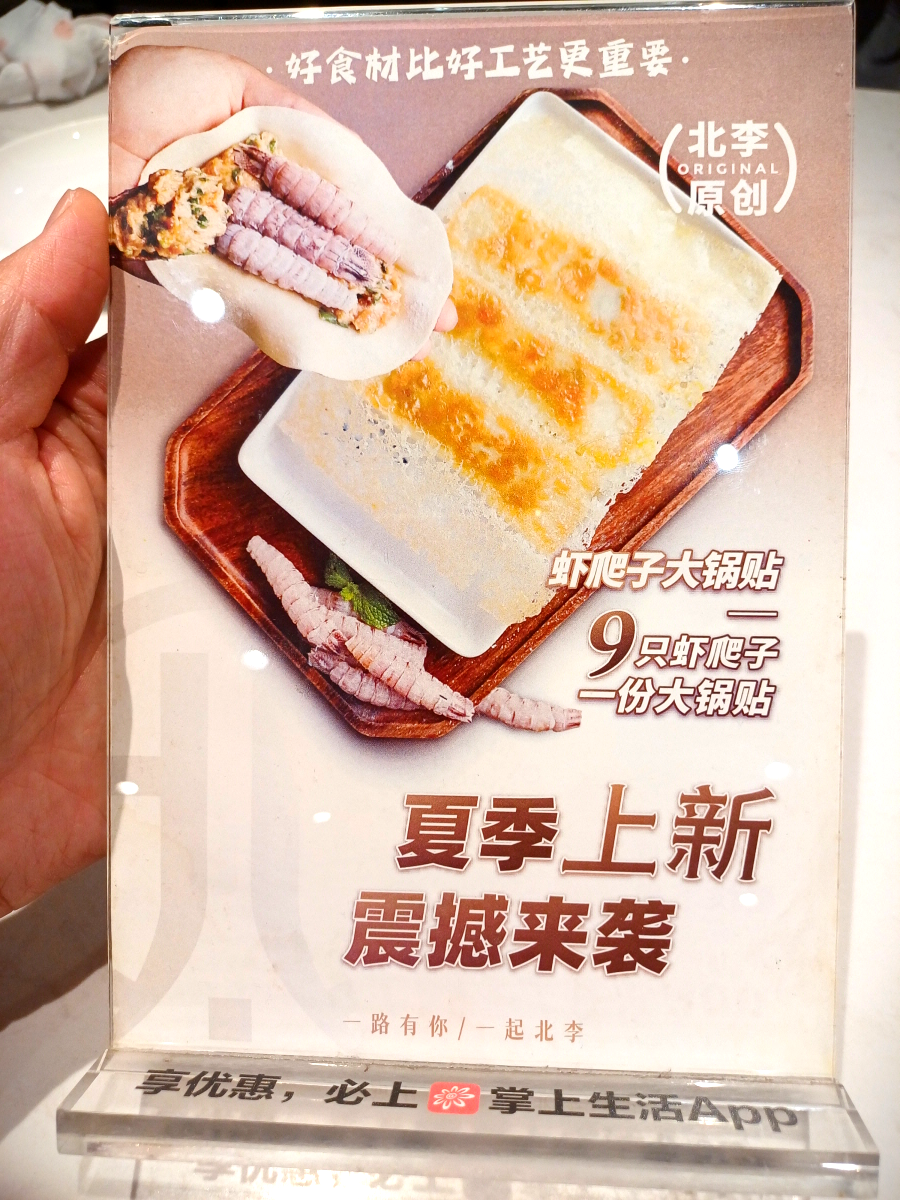 주문은 QR코드를 스캔하여 진행한다. 안내판 뒤면을 살펴보니 여름 신메뉴로 갯가재인 피피샤(皮皮虾)가 들어간 군만두인 궈티에(锅贴)를 홍보하고 있다. 갯가재는 내 취향이 아니라서 패스~