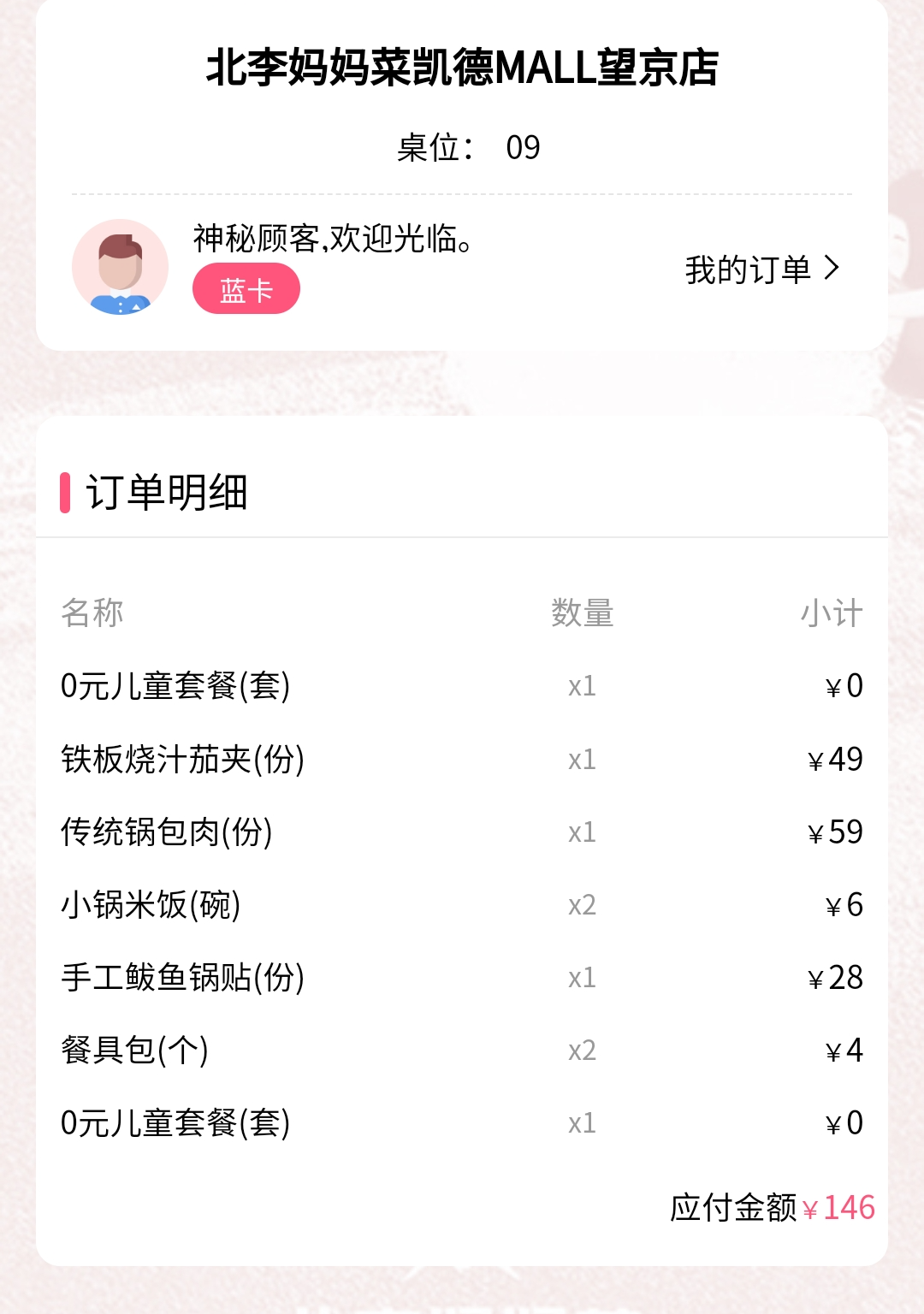 메뉴 3가지를 주문했고 밥 두 공기에 일회용 식기 두 개 포함해서 총 146위안(한화 약 2만 8천 원)으로 정말 가성비가 좋다.