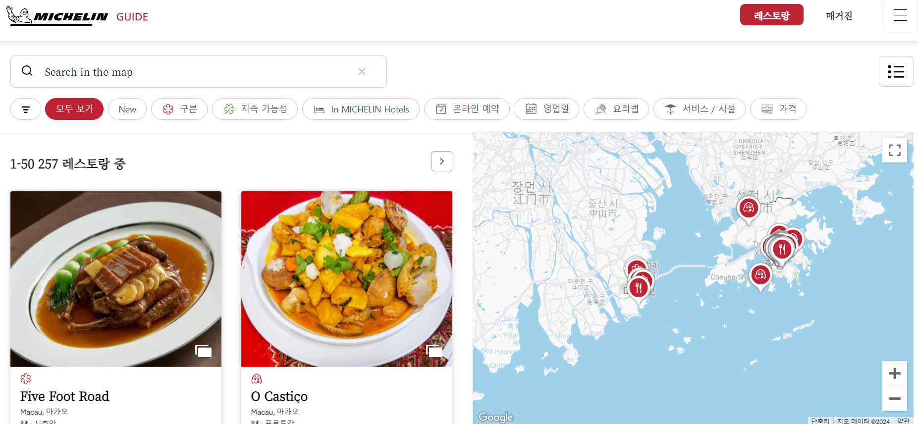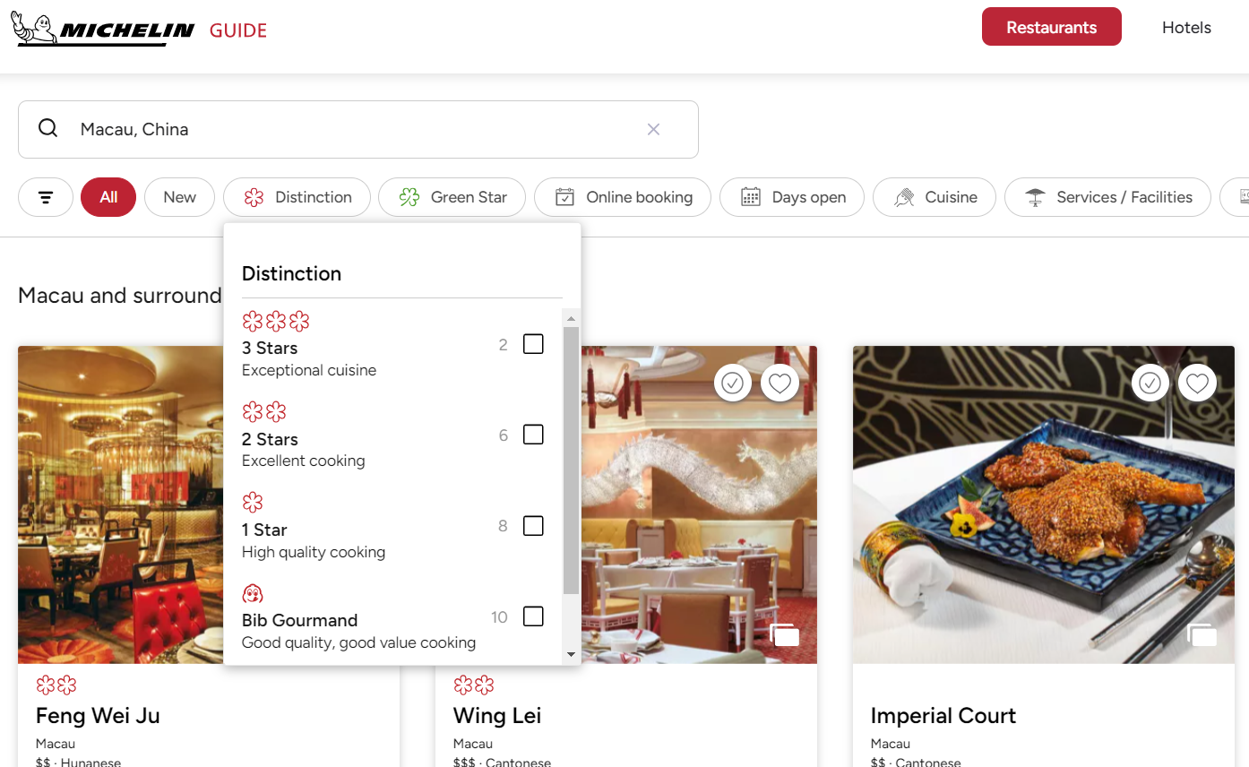 마카오도 별도로 구분되어 있고, 3스타 2곳, 2스타 6곳, 1스타 8곳, 빕구르망 10곳이 조회된다.