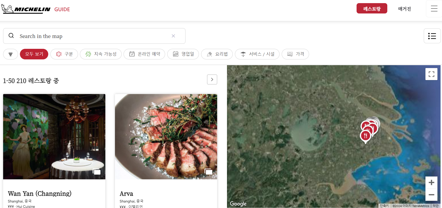 미쉐린 가이드의 공식 홈페이지에 가서 지역별로 검색이 가능한데 일단 중국을 키워드로 검색을 해봤다.