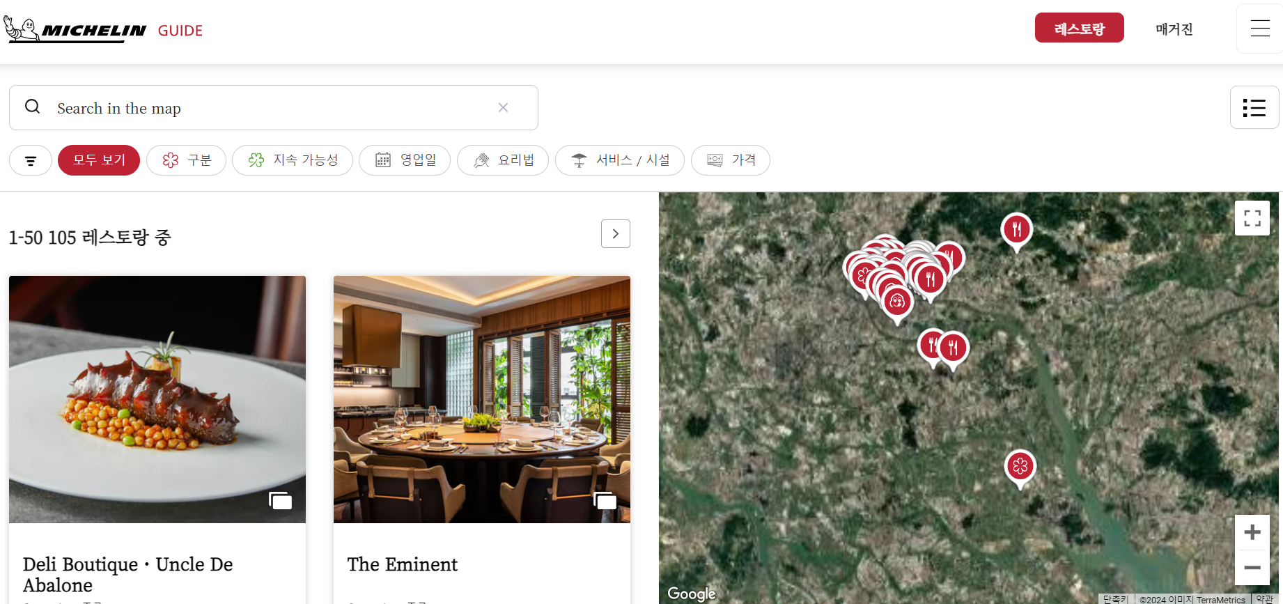 구글 지도로 해당 지역으로 이동하면 지도 내에 위치한 식당이 표시되는데, 식당이 표시되는 지역을 지도를 이동해 가면서 찾아봤다.