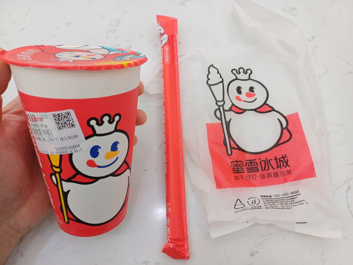 테이크아웃을 하니 미쉐빙청 케릭터 그림이 있는 작은 핸드캐리용 봉지에 음료를 담아 줬다. 이 포장과 빨대 값만 해도 1위안은 나올 것 같다.