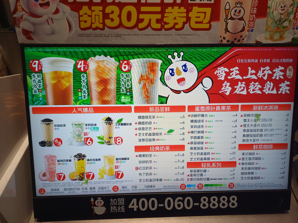 메뉴판을 살펴보니 메뉴의 수는 많지 않았으며, 대부분 10위안 이하의 가격대로 형성되어 있었다. 제일 저렴한 음료는 4위안이고, 제일 저렴한 아이스크림은 2위안으로 정말 부담 없이 구매해서 마실 수 있는 가격대다.