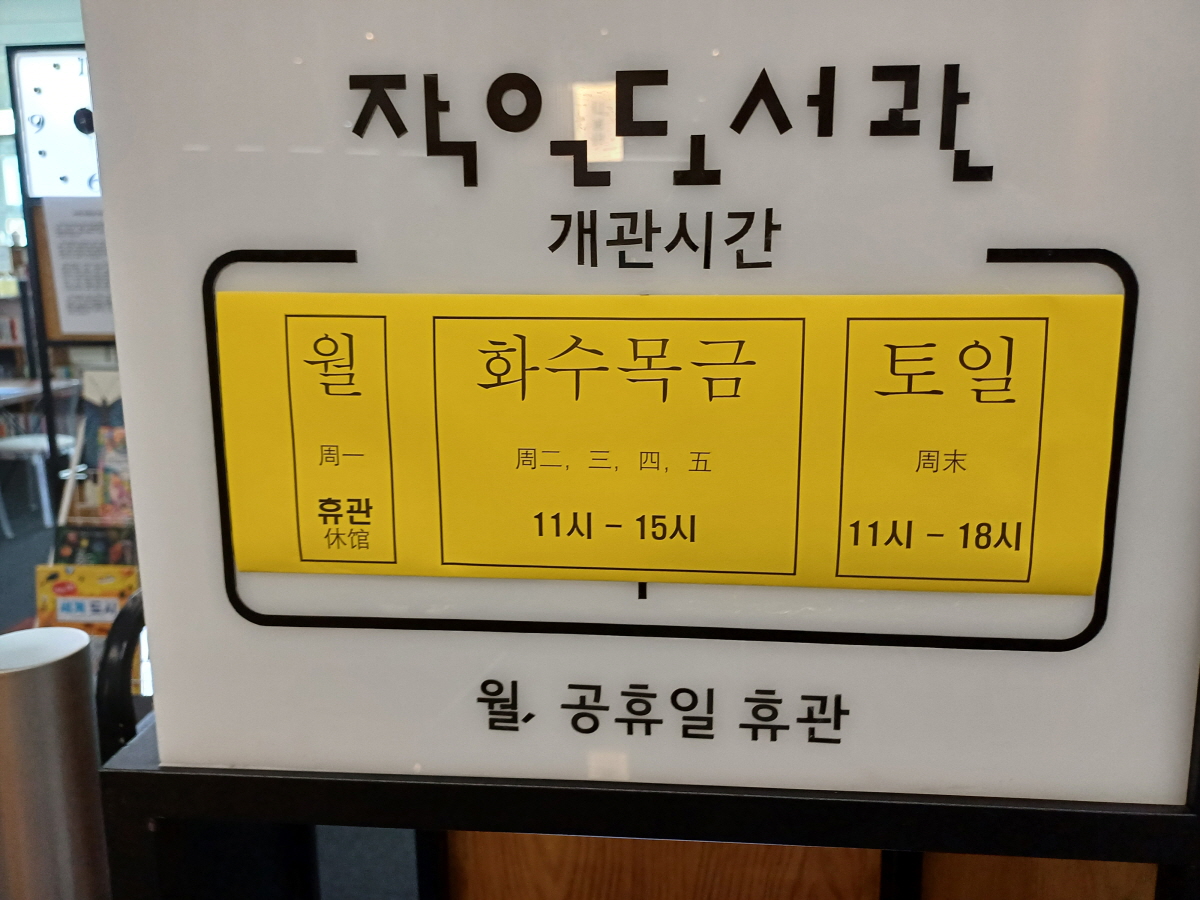 작은도서관 개관시간은 월요일/공휴일 휴관이며, 화수목금 11시~15시, 토일 11시~18시다.