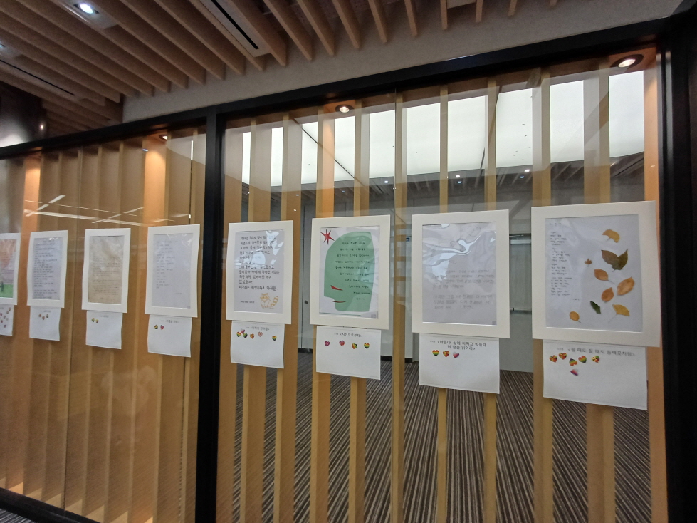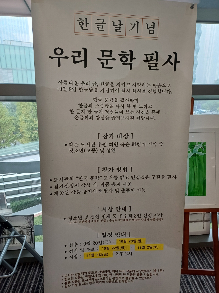 도서관 한쪽에 한글날 기념 우리 문학 필사 대회 작품을 전시하고 있었으며, 직원분께서 스티커 3장을 주고 투표를 해달라고 해서 정성이 보이는 작품에 소신껏 투표를 했다.