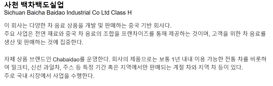 2024년에는 차백도의 모기업인 '사천백차백도실업주식회사(四川百茶百道实业股份有限公司)' 가 홍콩 증권거래소에 정식으로 상장하였다.