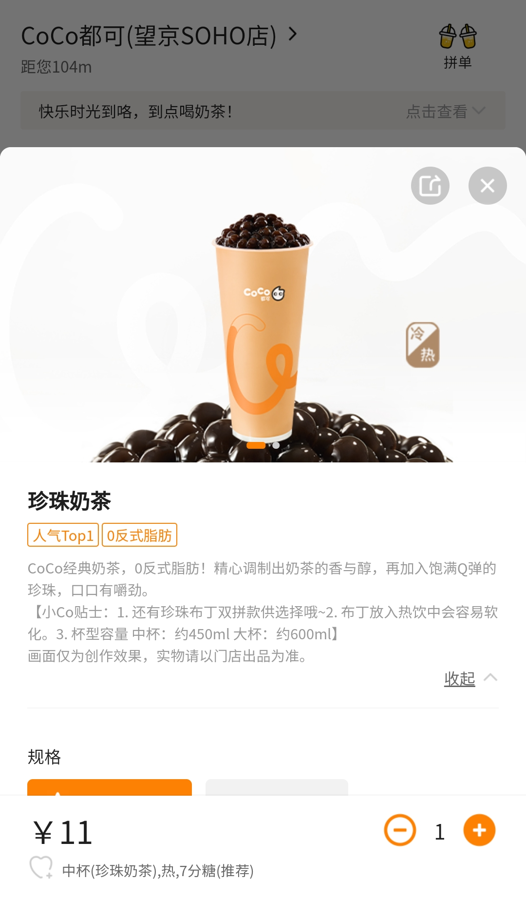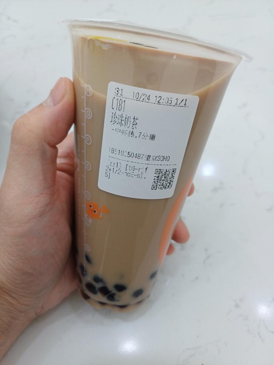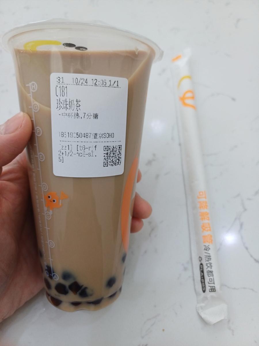 QR코드 스캔 후 가장 기본적인 메뉴인 버블티인 '쩐쭈나이차(珍珠奶茶)'를 주문했다. 역시 코코 메뉴 중 인기 탑 1이라고 적혀 있다.