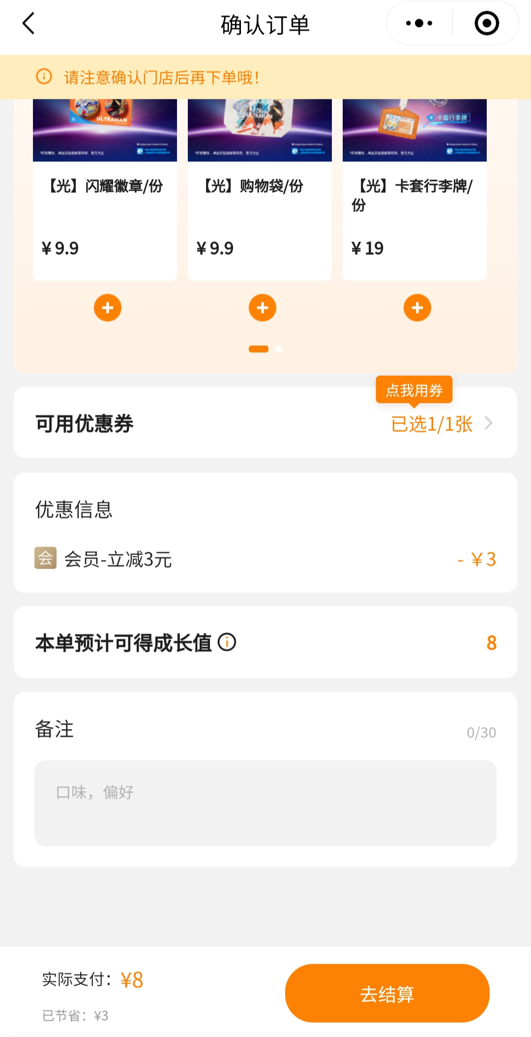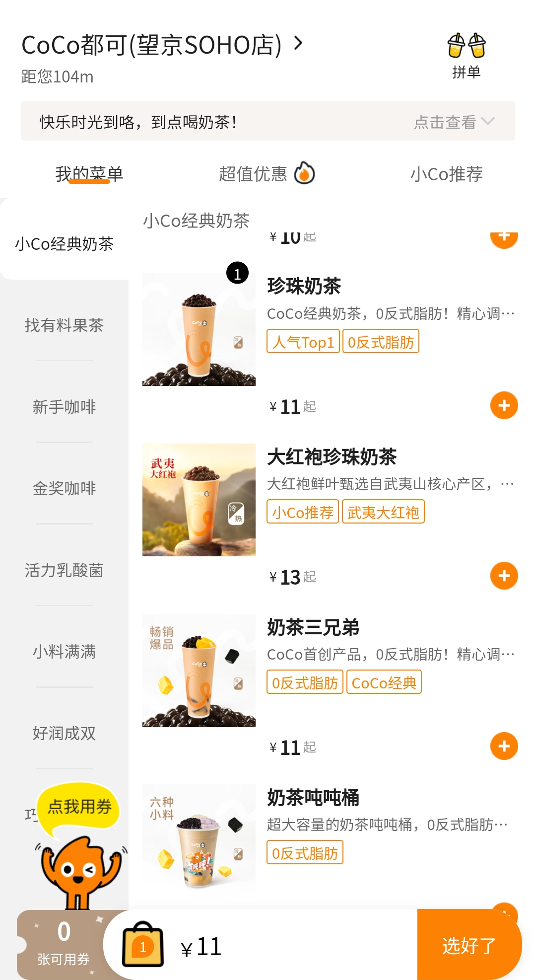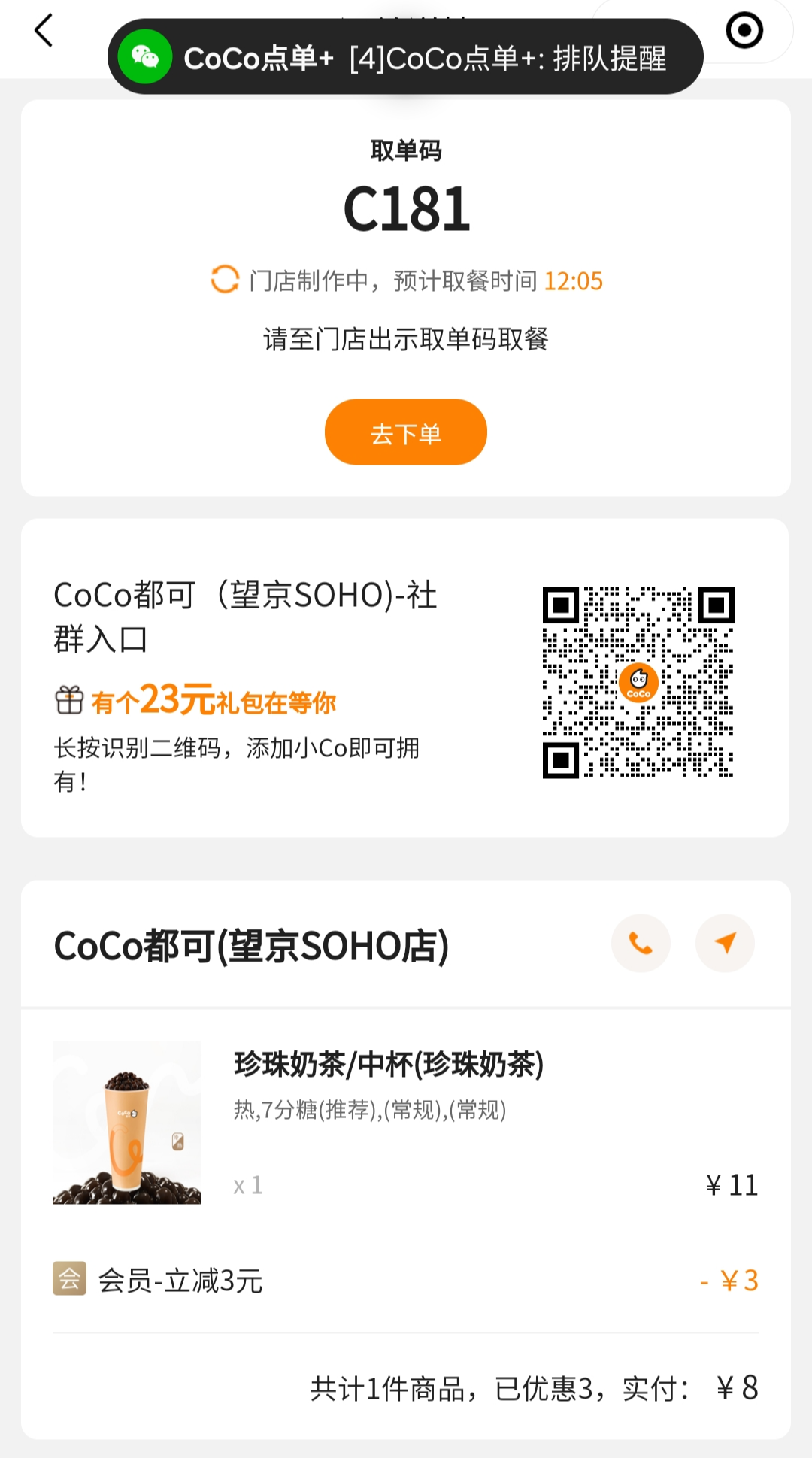 신규 회원 첫 잔 주문 시 3위안 할인 쿠폰을 받아서 총 8위안에 구매를 했다.