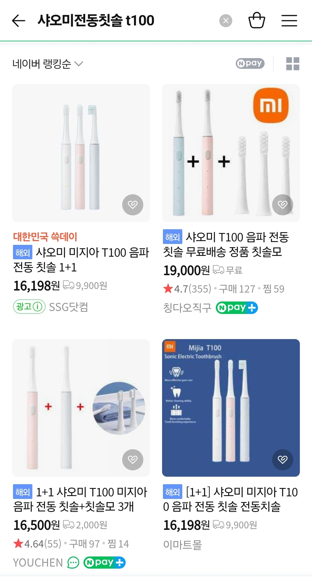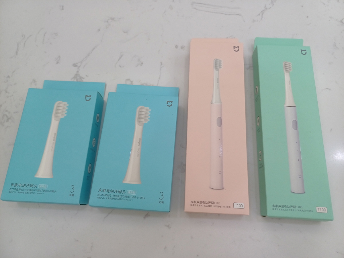 구매한 진동칫솔을 T100 번호의 제품인데, 샤오미 제품 중에서 가장 저렴한 라인업이다. 1+1으로 빨강, 파란색 제품 두 개를 묶어서 판해하는 것으로 구매했고, 여분의 칫솔모도 추가로 추가하여 구매했다.