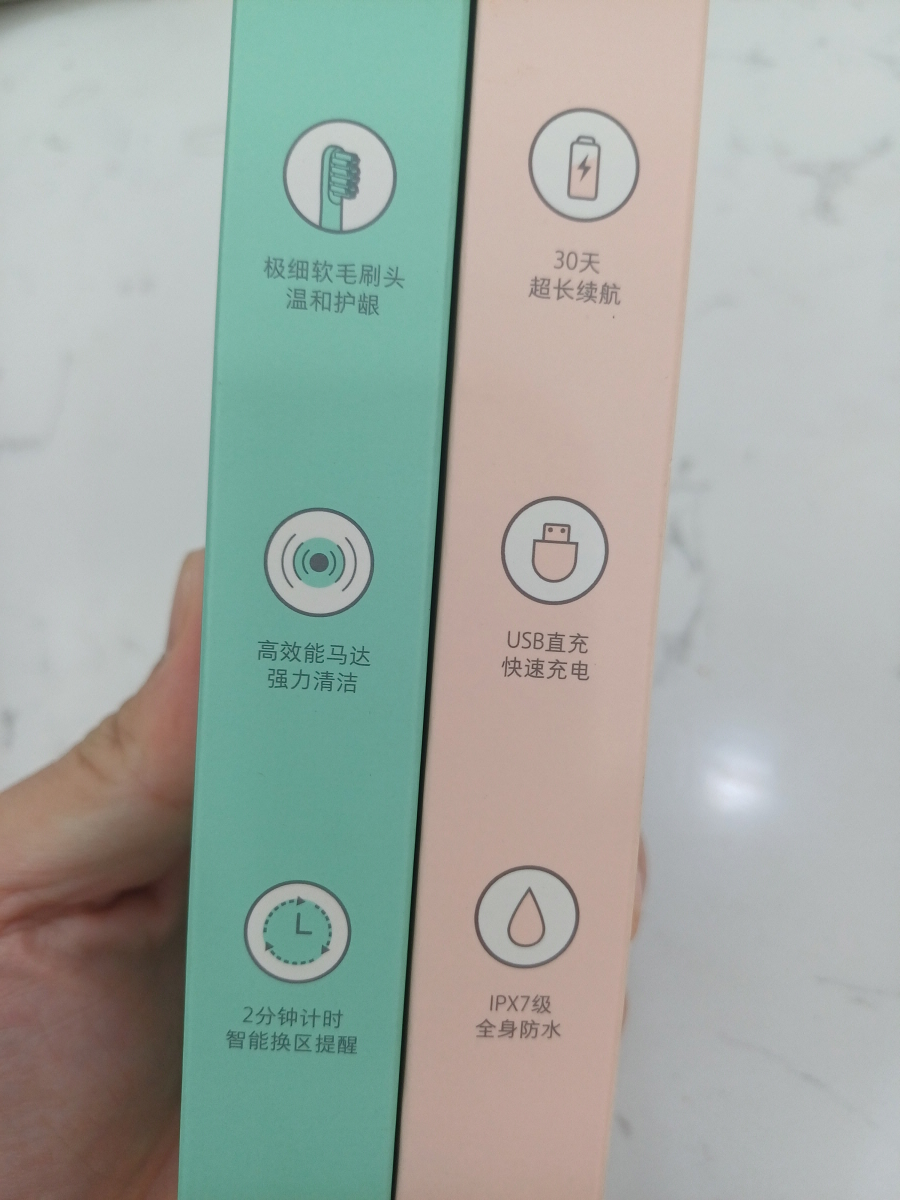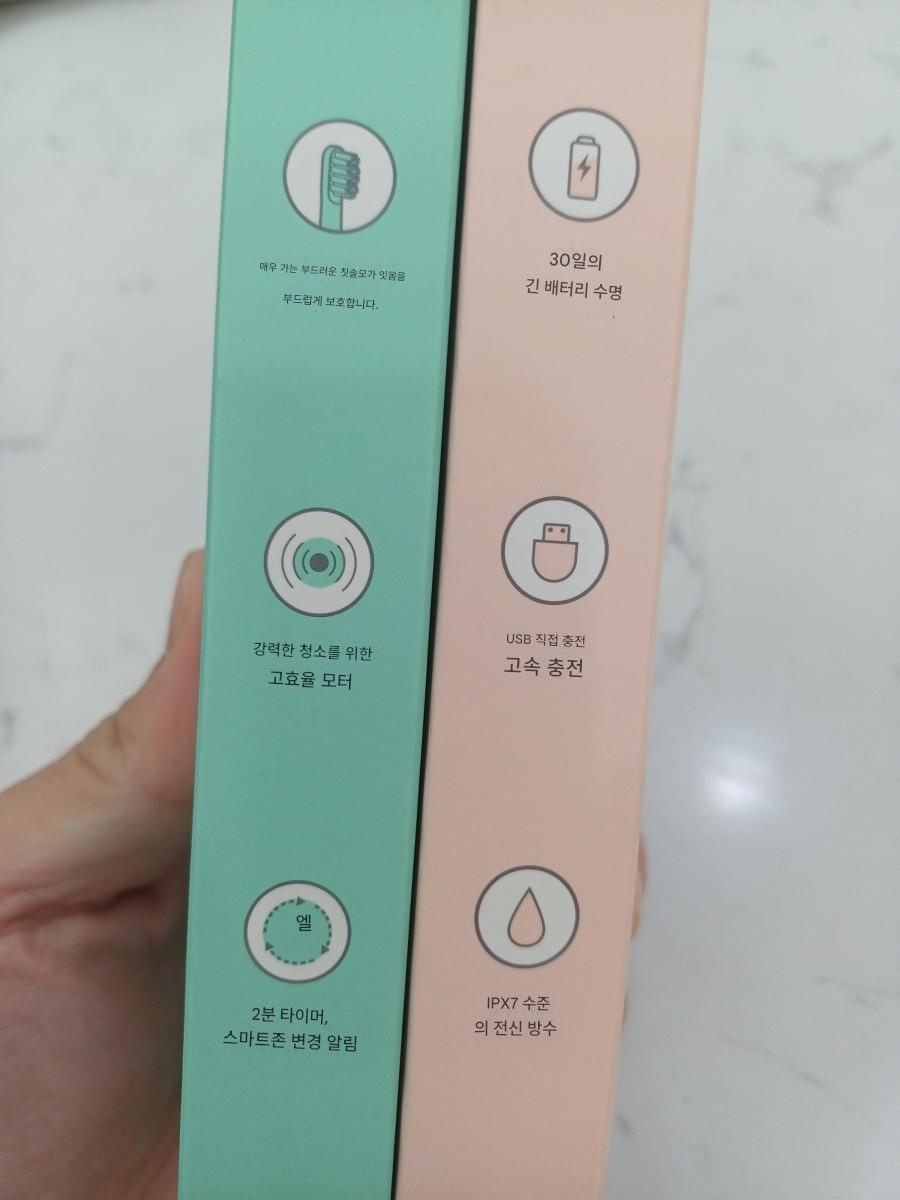 제품 박스 측면에 주요 기능이 적혀 있는데, 부드러운 미세모 칫솔, 고효율모터, 2분 타이머, 30일 배터리, USB충전, IPX7수준 전신방수 기능을 보유하고 있다.