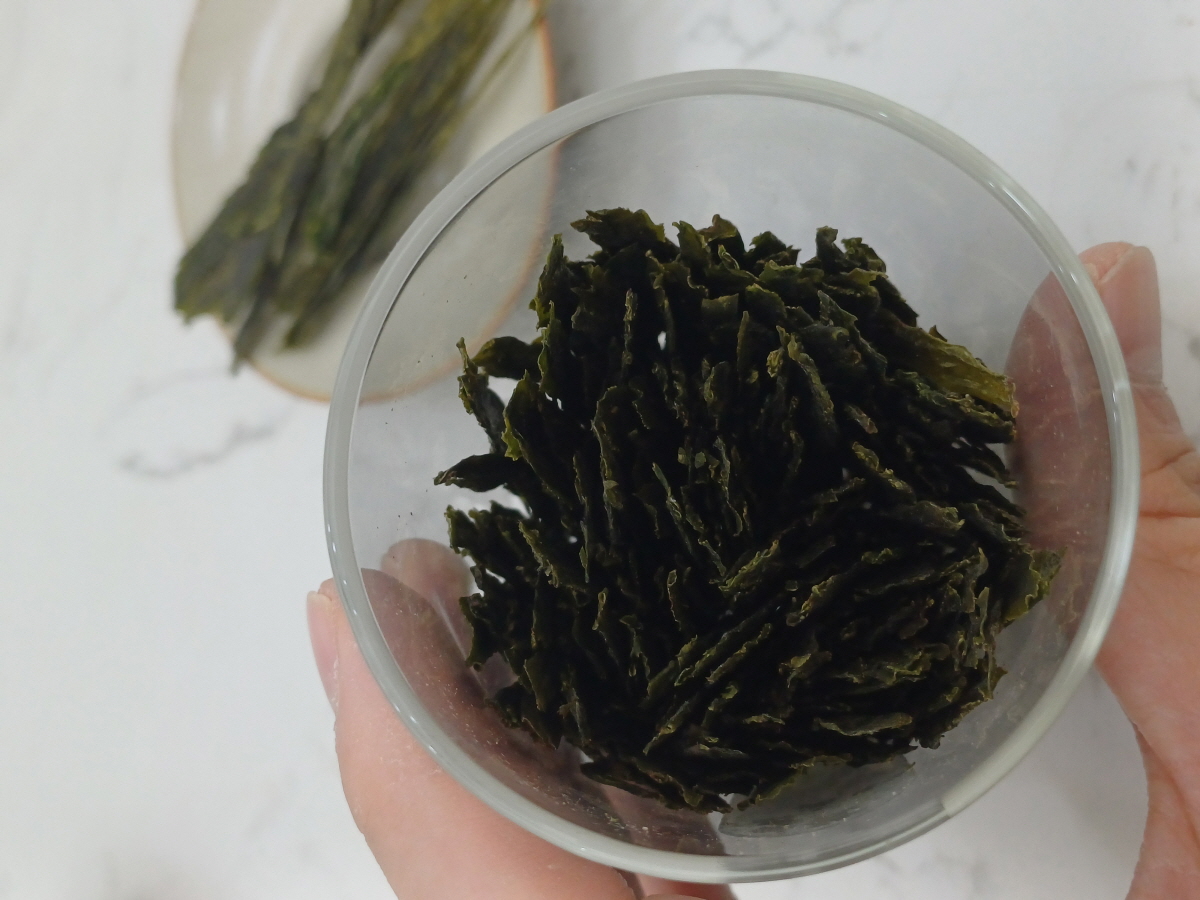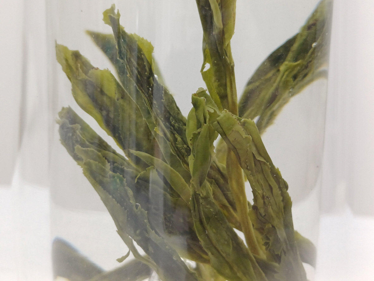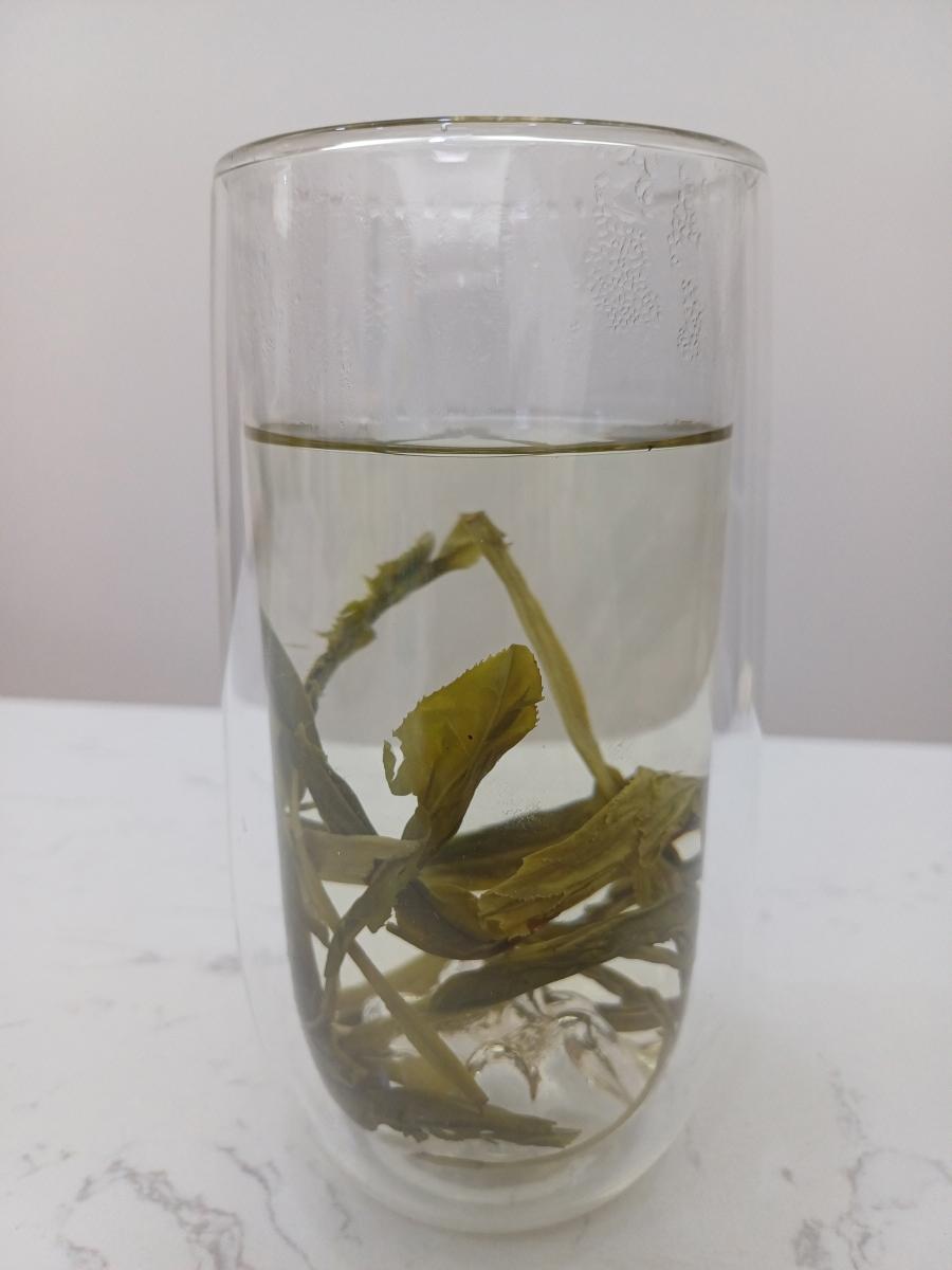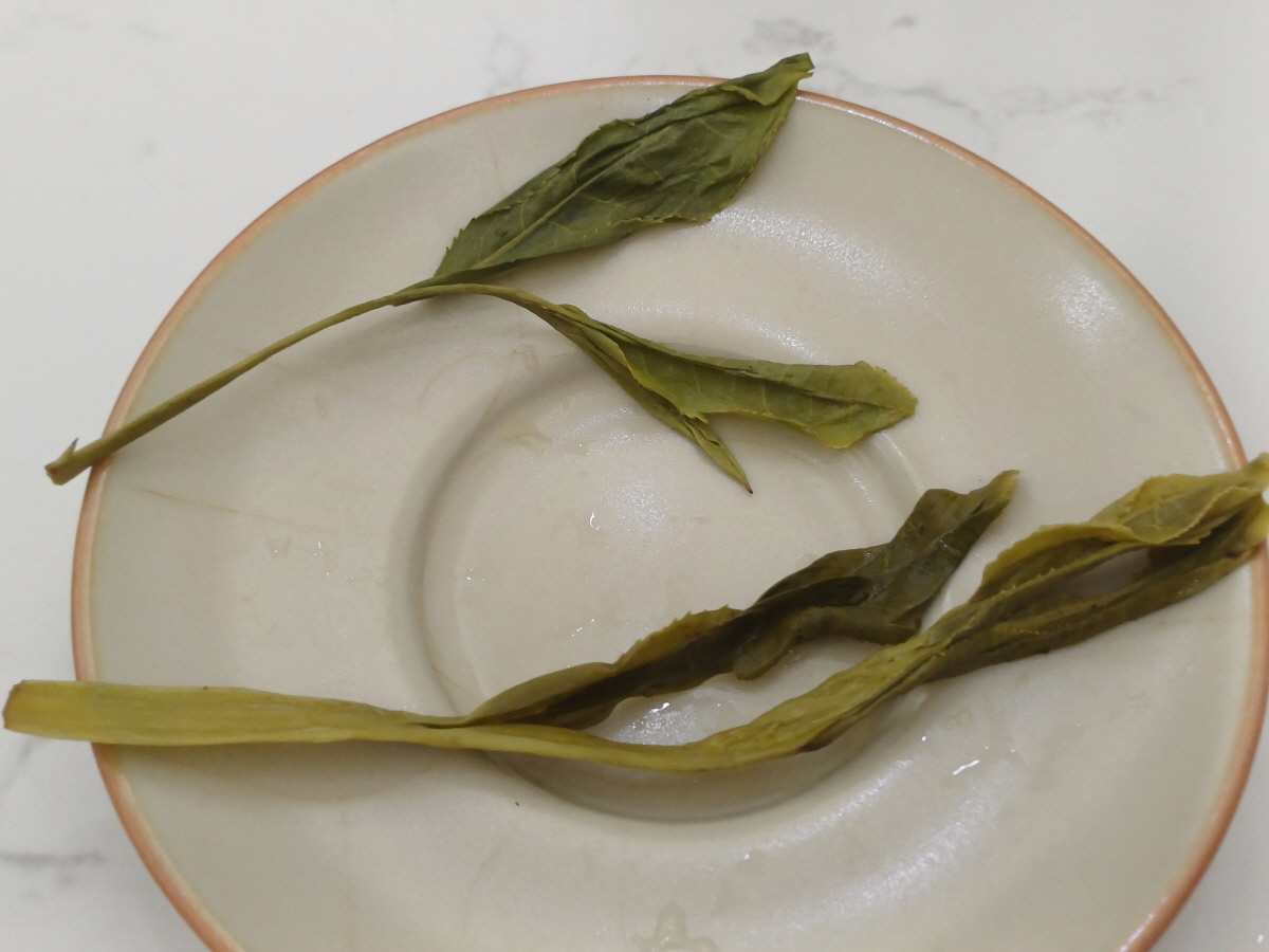 다 우려낸 후 찻잎을 꺼내 살펴보니 큼직한 찻잎의 모습을 볼 수 있었다. 찻잎 두 장이 하나의 새싹을 감싸고 있었으며 장대하고 튼실하다.