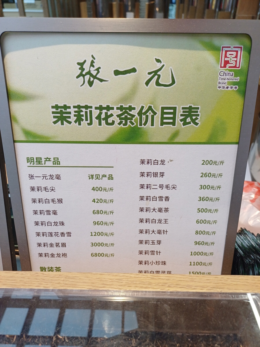 가격표를 살펴보니 주로 다양한 종류의 재스민 차를 판매하고 있었으며, 가장 저렴한 제품이 근당 200위안이었다.