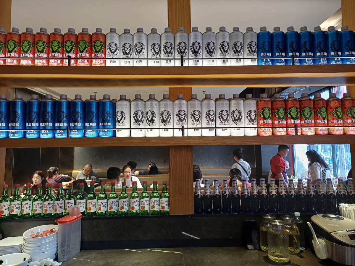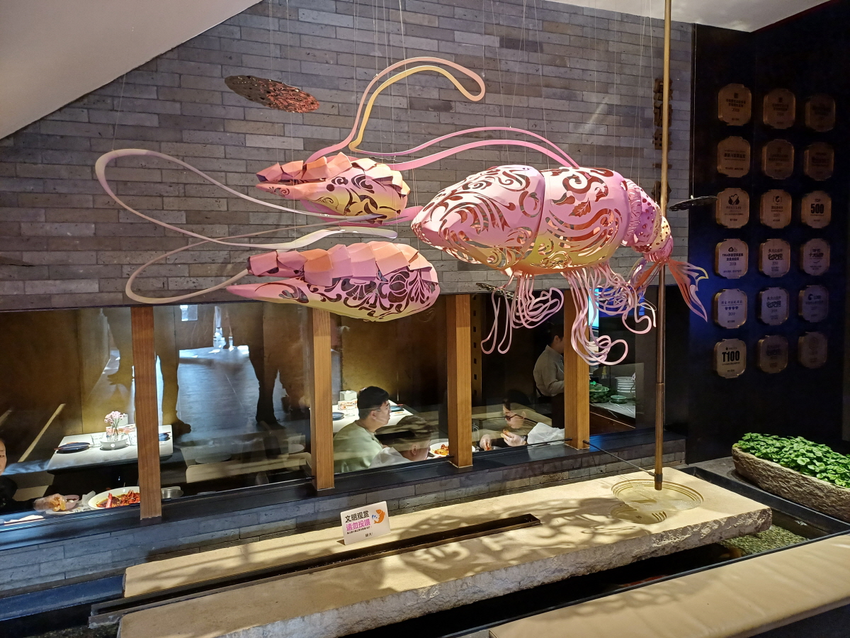 입구로 들어가 계산대를 살펴보니, 마오타이 술병이 일렬로 전시되어 있는데 이런 모습은 방문했던 중국 식당 중 처음이다. 롱샤의 모습을 한 조형물도 참 인상적이었다.