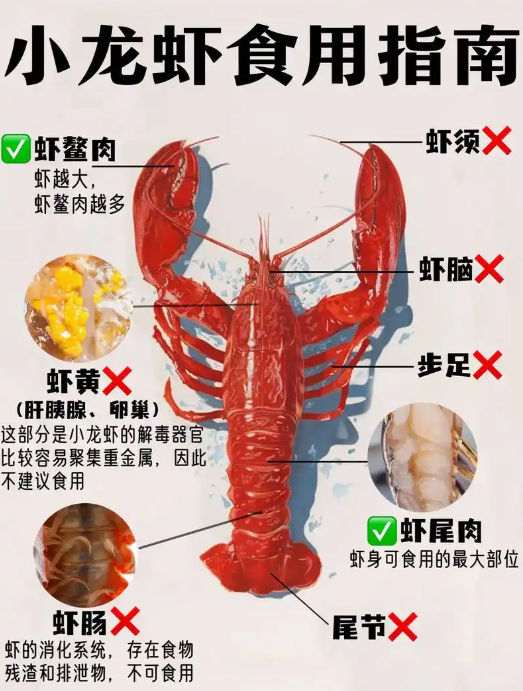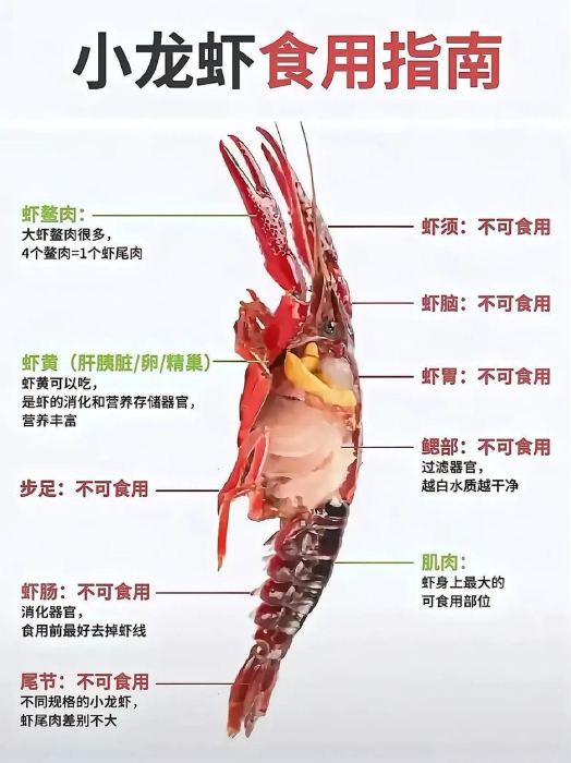 롱샤에서 먹을 수 있는 부분을 찾아보니, 롱샤의 집게발 속살과 꼬리 부분의 살은 공통적으로 먹을 수 있다고 나와 있는데, 알이 담겨 있는 부분인 샤황(虾黄/xiāhuáng)은 먹어도 된다는 나와 있기도 하고, 중금속 오염이 되어 있을 수 있어 먹지 말라고 나와 있기도 한다. 그리고 새우선을 먹지 말라고 나와 있는데 참 뭐가 정답인지 모르겠다. 그냥 취향대로 먹자.