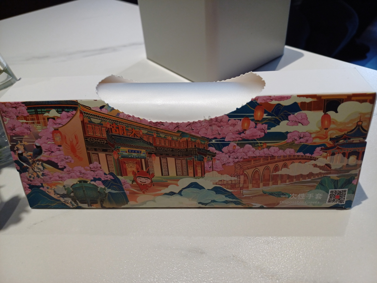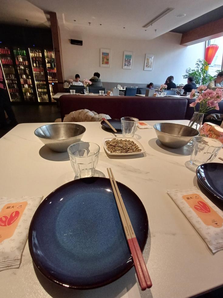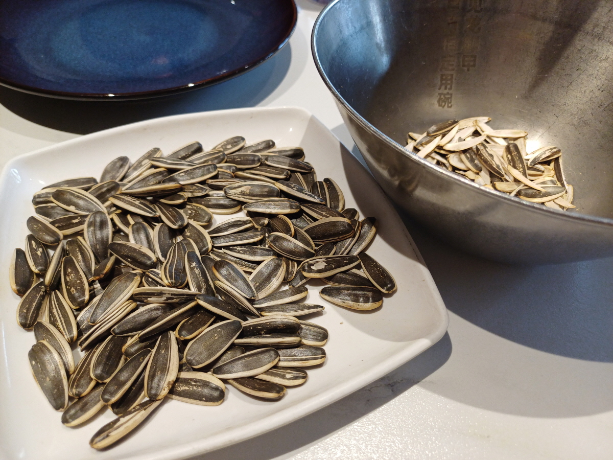 롱샤를 먹을 때 끼는 비닐장갑, 물티슈, 껍질을 담을 그릇이 기본적으로 세팅되어 있었다. 음식 나오길 기다리면서 먹으라고 해바라기씨를 먼저 가져다줬다.