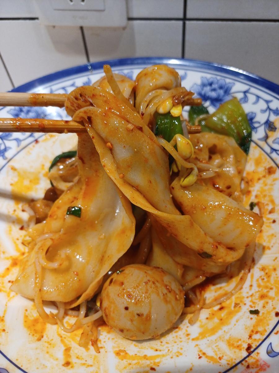 유포면의 면을 젓가락으로 집어 들어 올려보니 넓고 길게 만들어진 면이라 묵직한 느낌이 든다. 이 면을 중국에서 바지허리띠면이라는 뜻의 쿠따이미엔(裤带面/kùdàimiàn)이라고 부른다. 개인적으로 이 면의 식감이 너무 좋고 면의 표면적이 넓다 보니 고추기름 소스도 많이 발라져 있어 입에 넣으면 매운 소스의 향이 강렬하게 느껴진다.