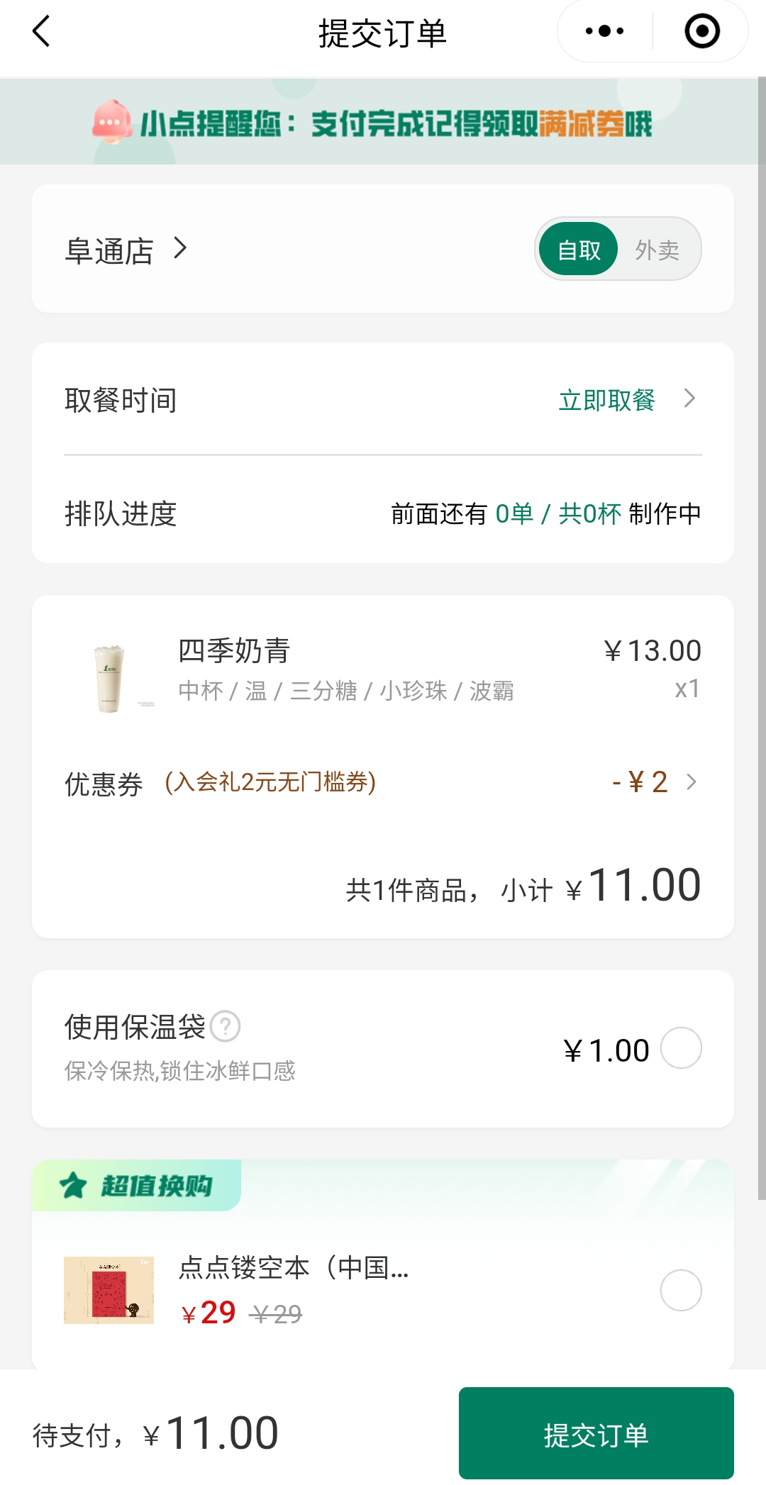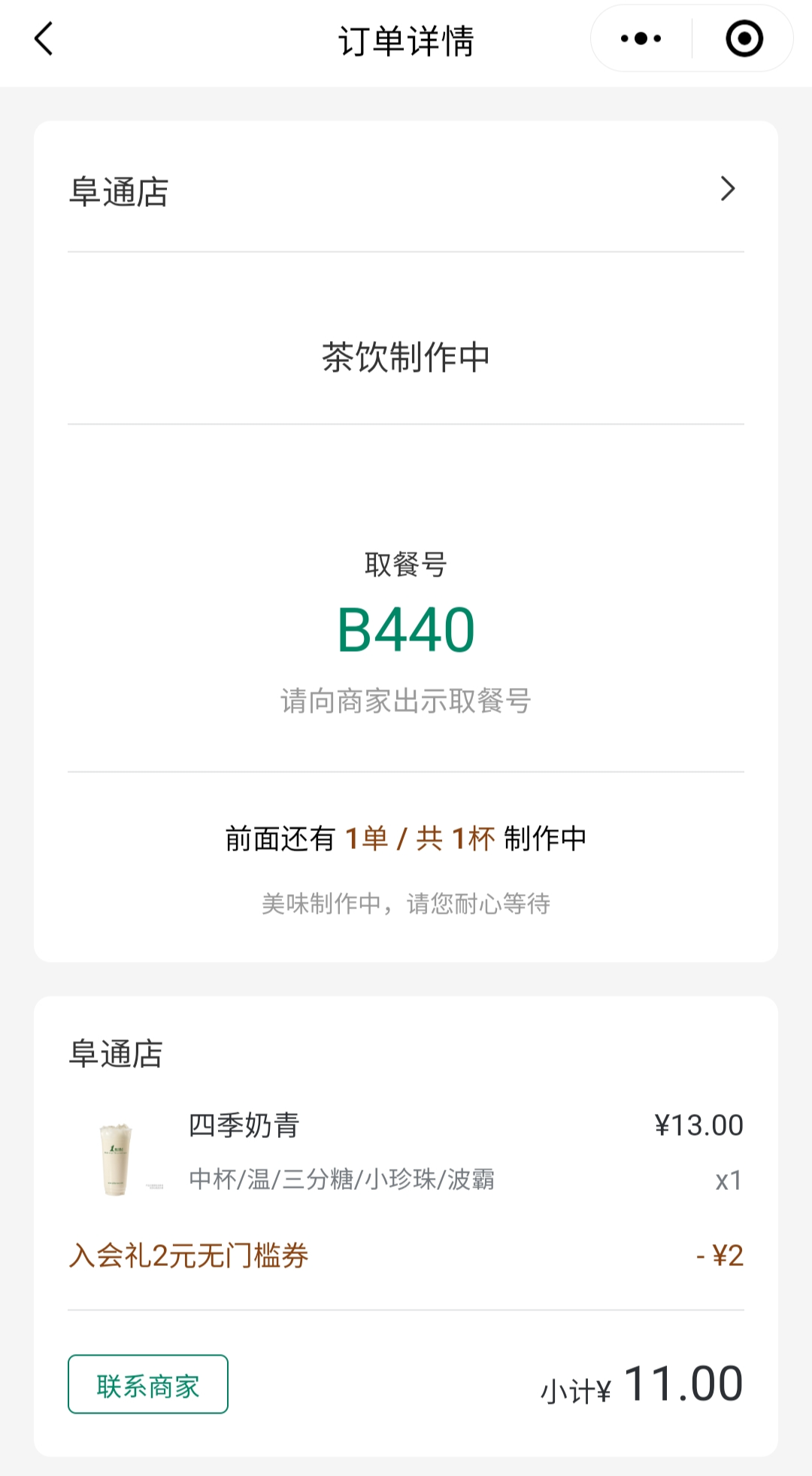 정가는 13위안인데 2위안 할인쿠폰 적용을 받아서 최종적으로 11위안에 구매를 했다. 주문 후 아주 신속하게 바로 음료를 받을 수 있었다.