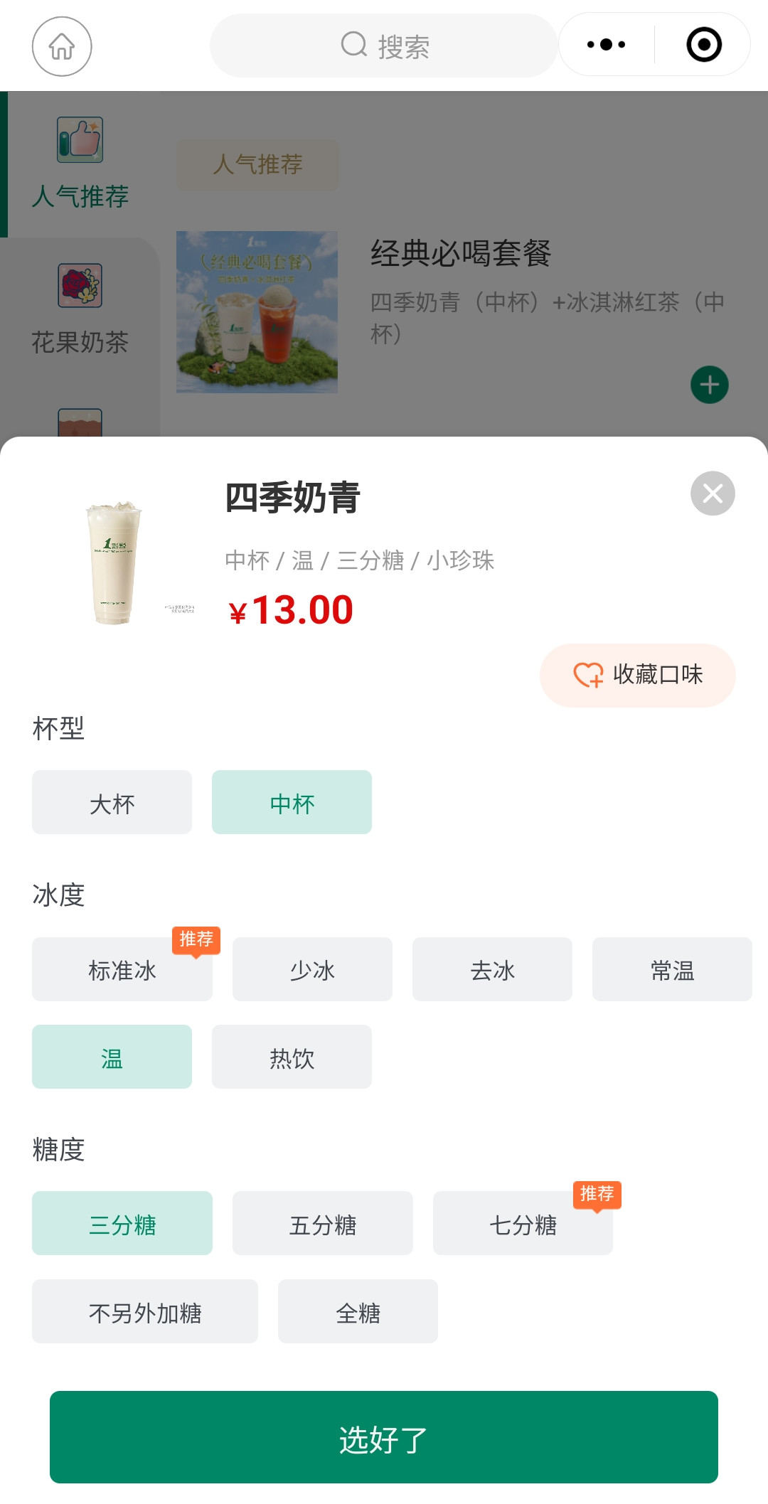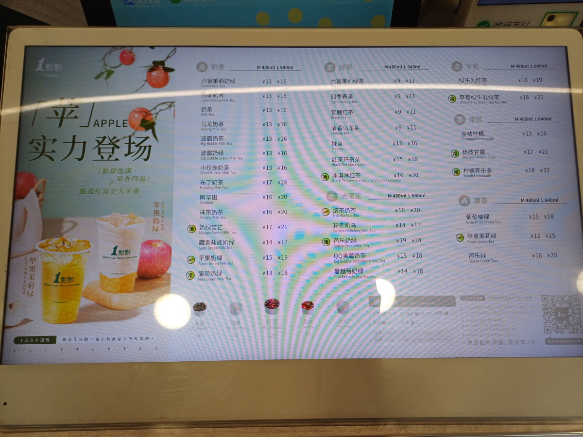 어떤 음료를 주문할까 고민하다 가장 잘 팔리는 베스트셀러 제품인 '사계내청(四季奶青/sìjìnǎiqīng) 이라는 우롱차와 녹차 베이스의 밀크티를 주문해 봤다.