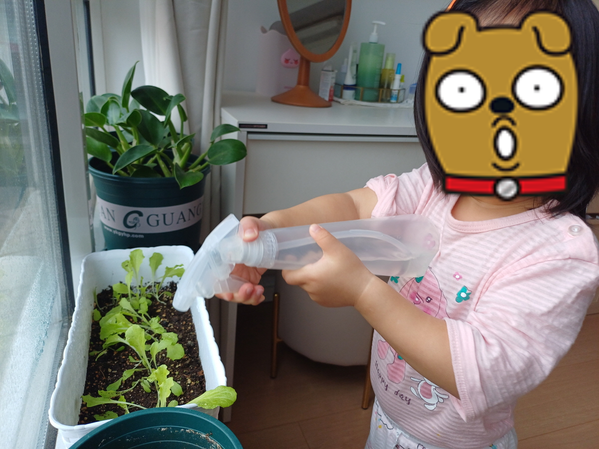 상추씨를 심은 뒤 매일 아침 아이와 함께 분무기로 물을 줬는데 매일매일 쑥쑥 자라는 상추를 보며 즐거워하는 아이를 보니 교육용으로 심기 참 잘했다는 생각이 들었다.