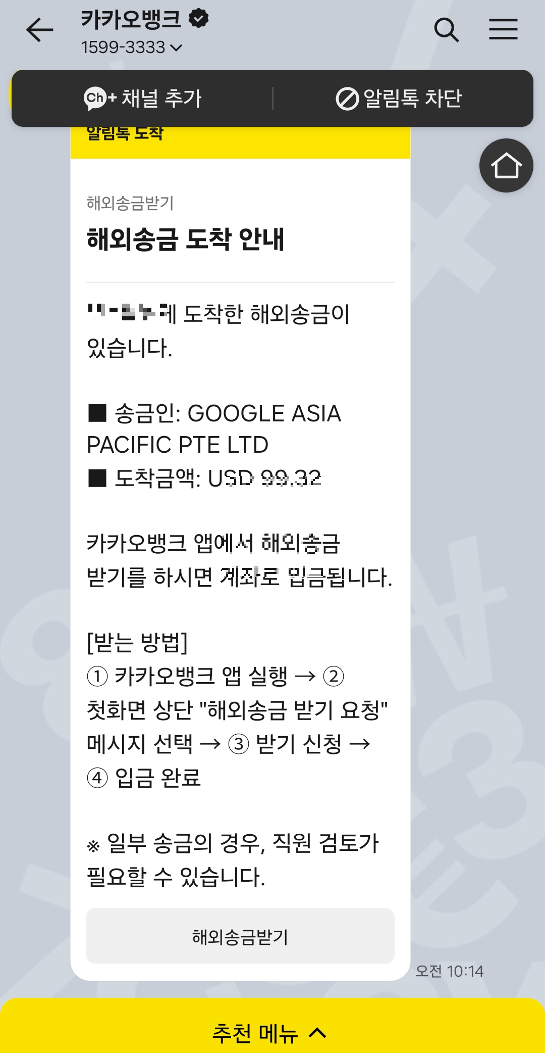티스토리 블로그를 운영하며 발생하는 에드센스 광고 수익이 워낙 미미해서 사실상 블로그로 돈을 번다는 사실을 잊고 있었는데, 아침에 갑자기 카카오뱅크 해외송금 도착 안내 메시지가 왔다.