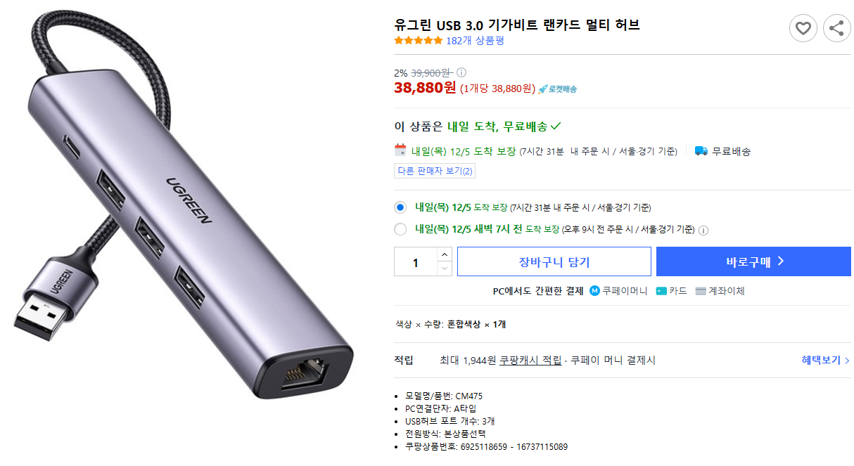 USB나 SD카드 리더 기능도 있으면 좋을 것 같아서 다기능 허브를 찾아봤는데 유그린이라는 익숙한 브랜드의 제품이 보여서 이 제품으로 구매를 했다.