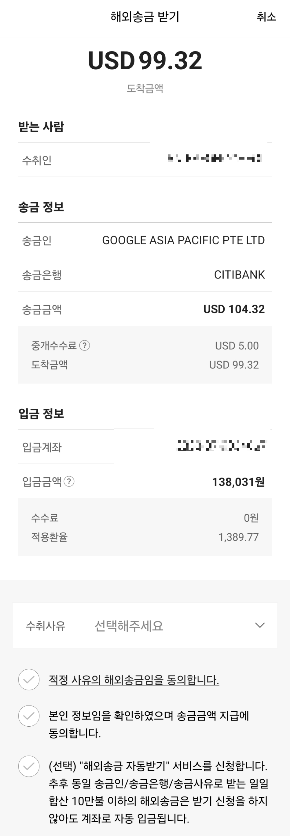 에드센스 누적 수익금이 최소 정산 기준 수익금인 $100이 넘어서 드디어 구글에서 내 계좌에 달러를 보내줬다. 중개 수수료인 $5를 제외하고 $99.32를 정산받았으며, 원화로 환전된 138,031원을 최종 입금받았다.