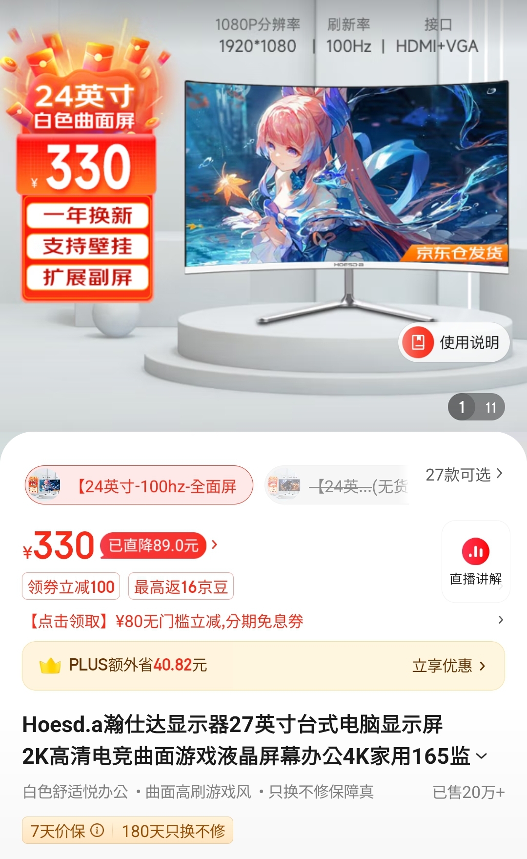 모니터의 용도를 블로그 작성 및 사무용으로 위주로 한정하고, 24인치 정도의 사이즈의 중국산 제품을 검색해 보니 약 인민폐 300위안 좌우에서 구매가 가능했다.
