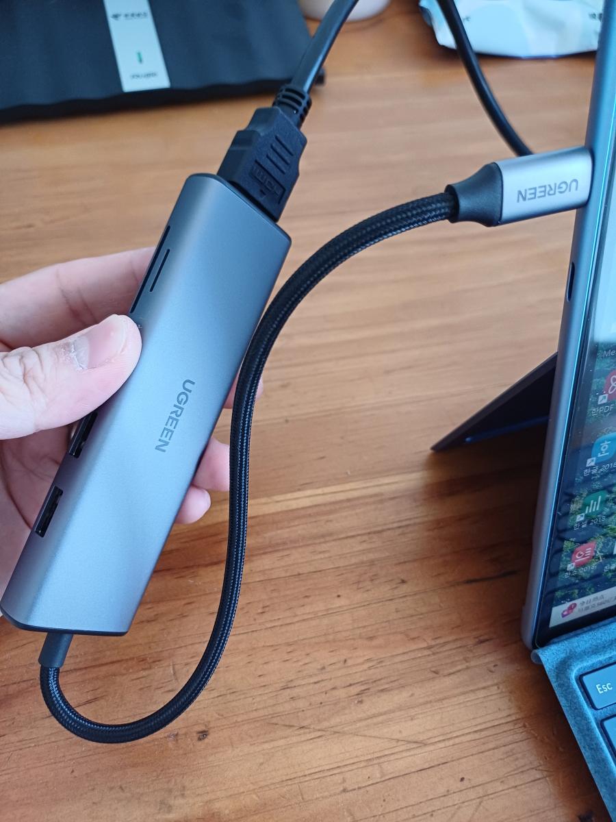 모니터와 연결된 HDMI케이블을 허브에 연결하고, 허브의 C타입 단자를 서피스프로 본체에 연결하면 끝이다. USB포트와 SD카드 슬롯도 있기 때문에 추후에도 활용도가 높을 것 같다.
