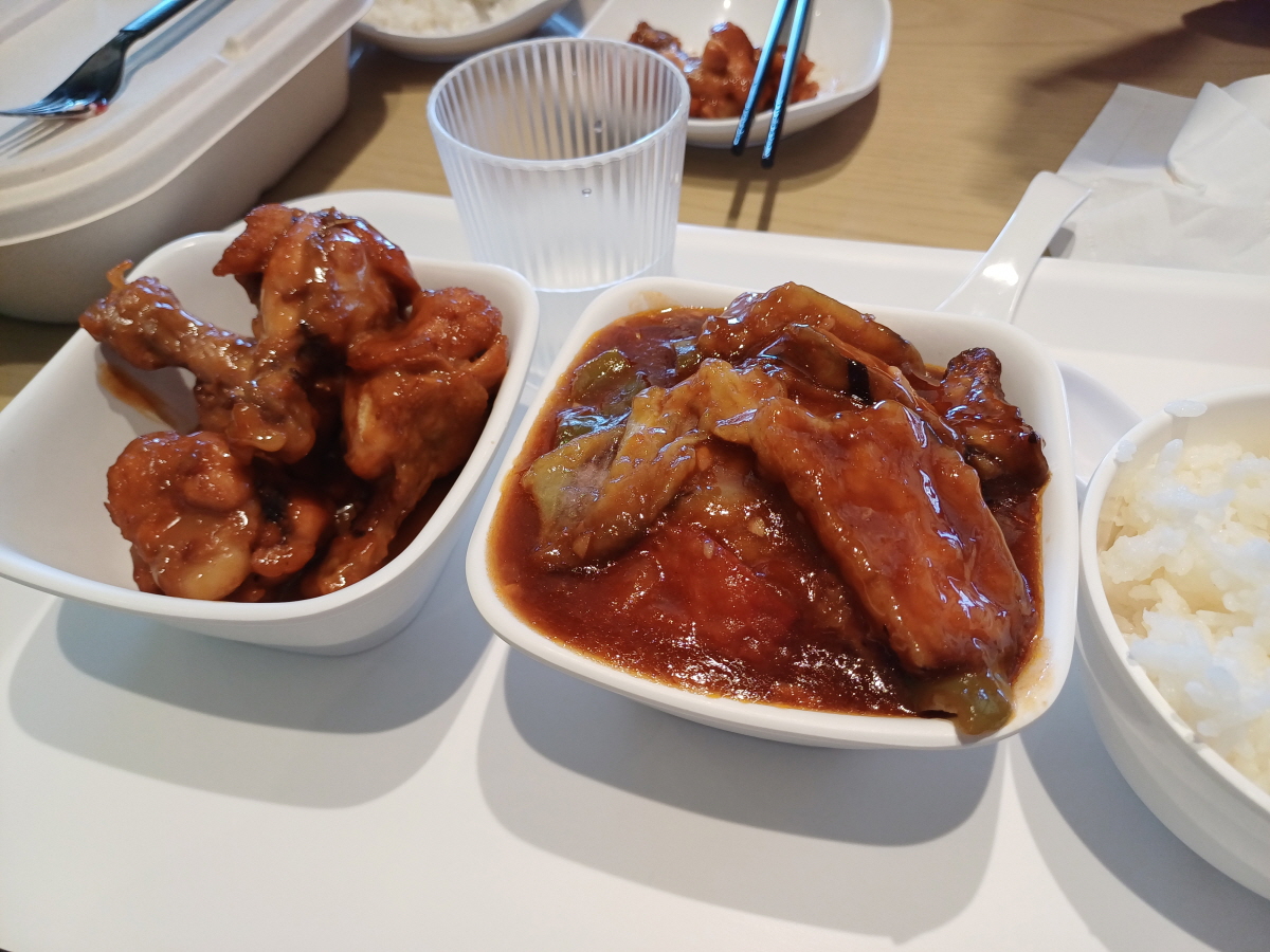 제5식당에서는 점식식사를 했는데, 콜라치킨과 가지요리를 주문하고 외부에서 구매한 빵과 함께 먹었다. 외부 음식은 조금 들고 가도 상관없으니 참조하면 좋을 듯하다.