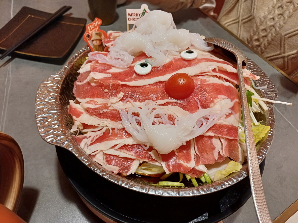 메뉴는 일본식 스키야키 요리인데 얼굴은 얇은 소고기로, 수염은 당면으로, 눈은 사탕으로, 코는 방울토마토로 산타의 얼굴을 형상화했다. 아이디어가 참 좋았다. 맛은 솔직히 특별한 것은 없었다.