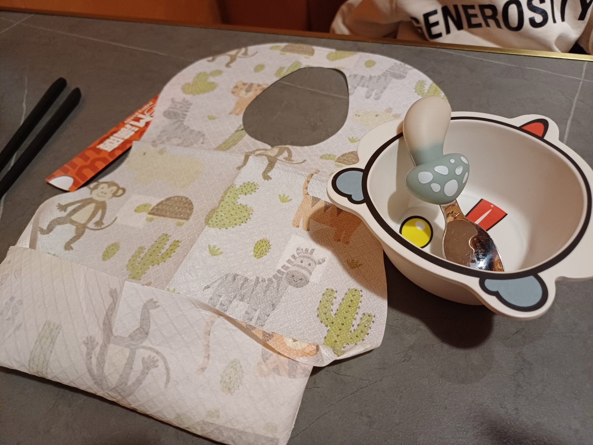 아이 전용 식기와 일회용 턱받이를 주는데, 중국에서 간 식당 중 턱받이를 주는 곳은 이곳이 처음이었다.