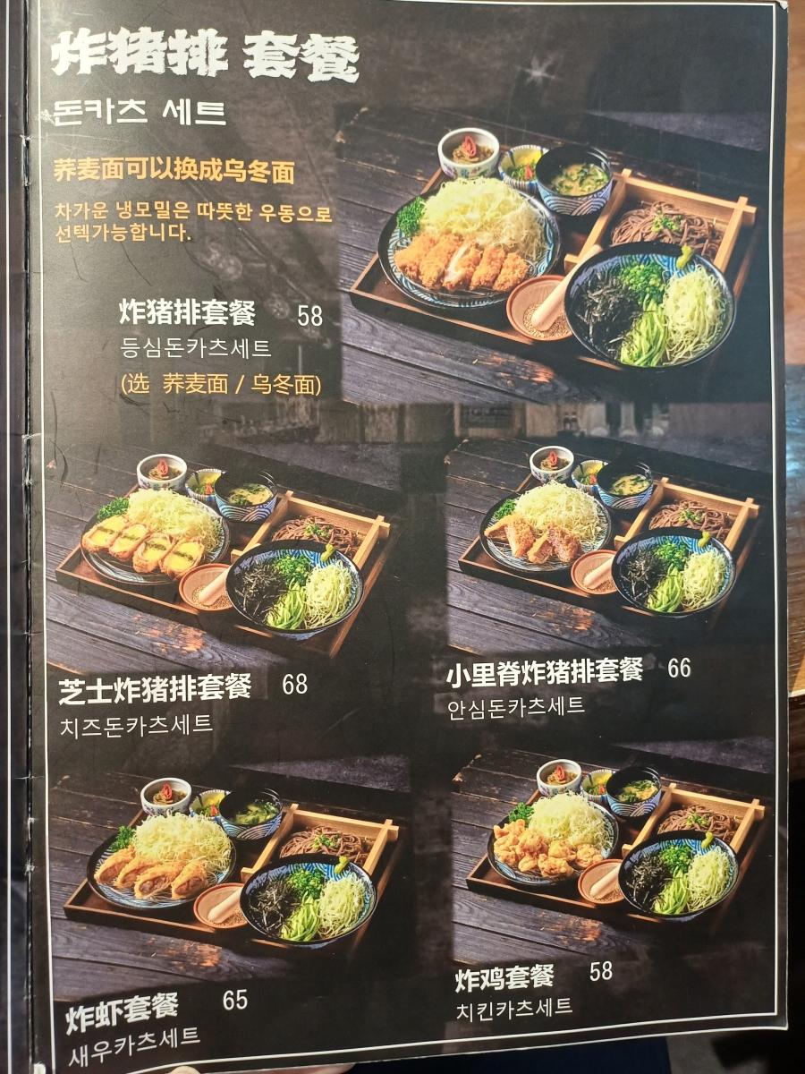 등심, 안심, 치즈, 새우, 치킨가츠 기본 메뉴와 우동이나 모밀이 추가되어 있는 세트메뉴도 있었으며, 추가비용을 내면 반인분 추가도 가능했다.