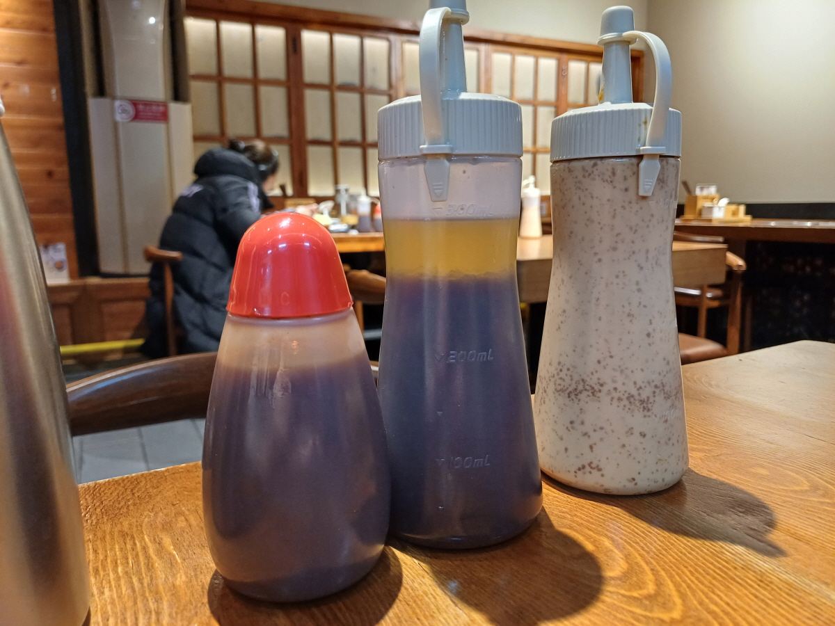 간단 식기와 시치미, 돈까스 소스와 샐러드드레싱이 기본으로 세팅되어 있었다.