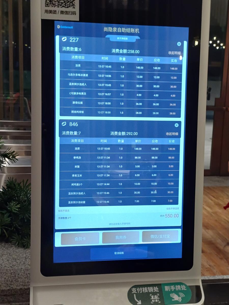 정산을 해보니 어른 2인 이용권 RMB 296, 모래 놀이터 이용 비용 RMB67, 2끼 식사 및 간식 RMB187, 총합계 RMB550원이 나왔다. 세 가족이 온천과 모래 놀이터를 즐기고 두 끼 식사까지 한 비용 치고는 나름 괜찮았다.