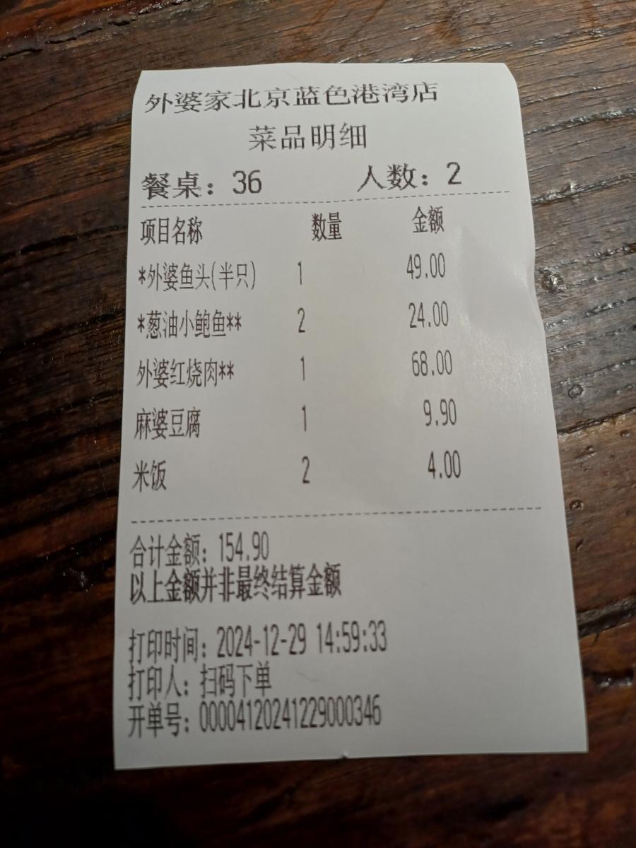 QR코드를 스캔하여 음식 주문이 가능하다. 음식 4개를 시키니 RMB154.9이 나왔는데 정말 가성비 최고다.
