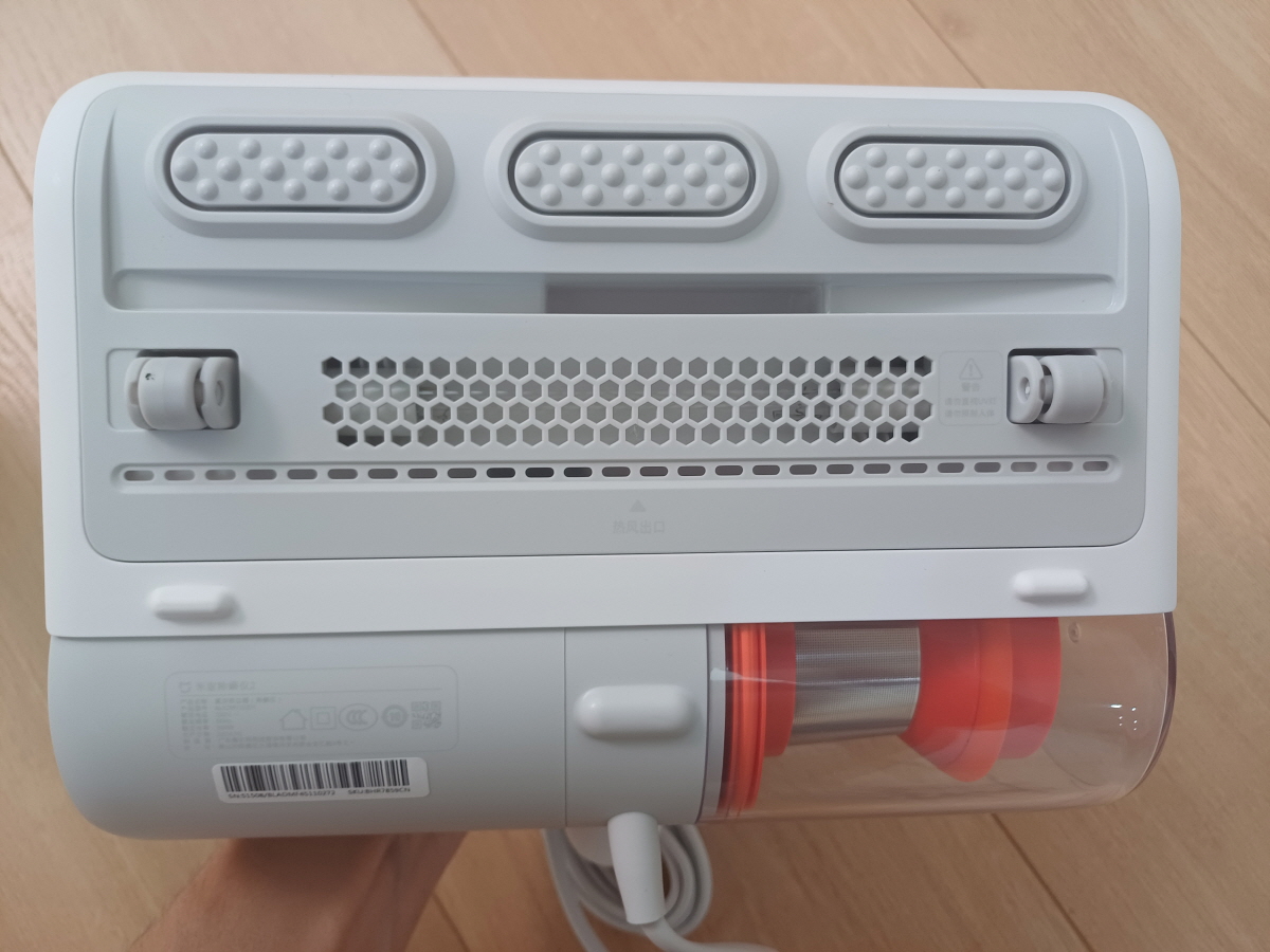 청소기 바닥을 살펴보면 제일 상단에 침구를 두들겨주는 타격 패드가 3개 자리 잡고 있고, 그 아래에는 흡입구와 UV 자외선 전구가, 그 양 옆으로는 압력을 가하면 안으로 들어가는 롤러가 자리 잡고 있다.