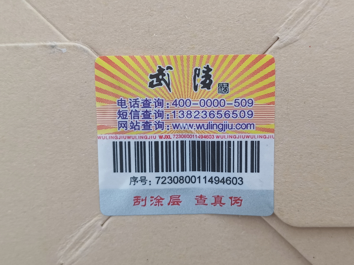포장 봉인을 뜯으면 스펀지에 고정되어 있는 술병이 나온다. 박스에 QR코드를 스캔하면 무릉주 정보가 담겨 있는 위챗 공중 계정으로 연결되고, 가짜 여부도 확인 가능한 바코드도 박스 하단에 붙어 있다.