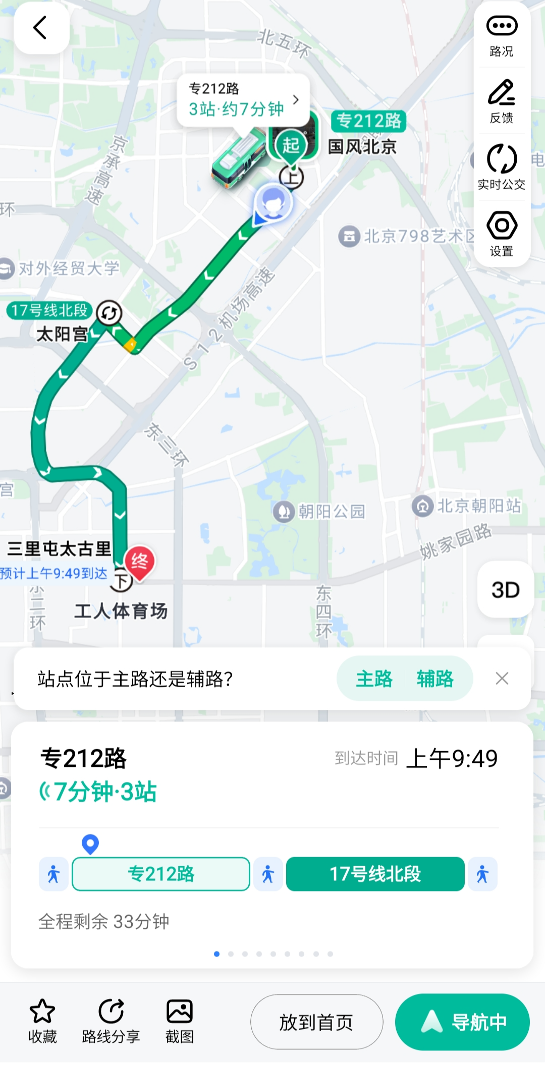 오늘의 목적지는 싼리툰(三里屯), 고덕지도(高德地图)에 검색을 해보니 먼저 버스로 이동 후 중간에서 지하철로 환승하는 노선이 가장 빠르다고 해서 먼저 버스를 타고 이동을 해봤다. 고덕지도로 검색을 하면 타려고 하는 버스가 언제 도착하는지, 그 버스가 오고 있는 위치도 실시간으로 확인이 가능하다.
