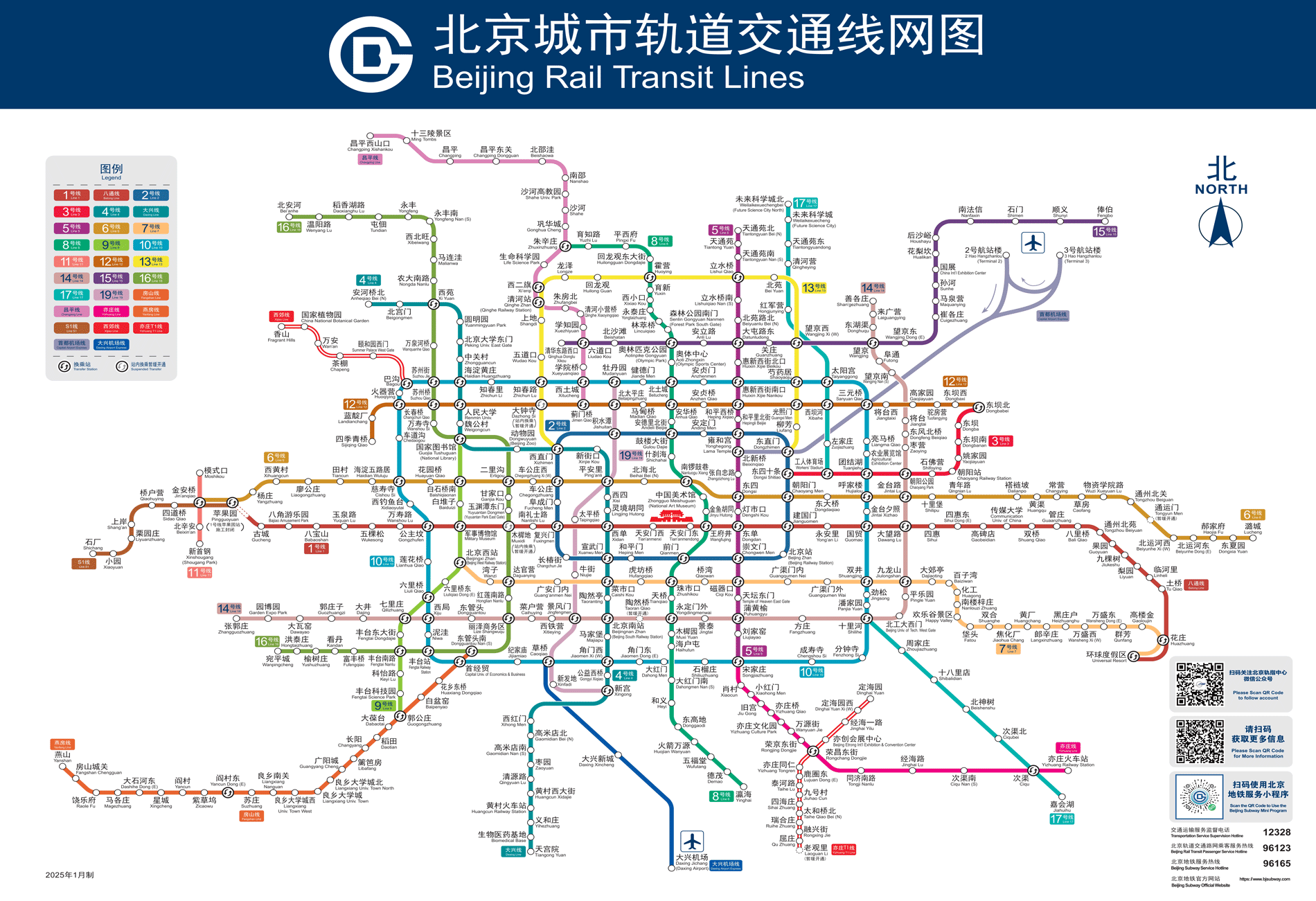 1971년 1월 처음으로 개통한 베이징 지하철은 2025년 1월 기준 총 29개의 노선, 총 운영거리 879km이며 연간 승객 수는 약 22억 명, 하루 최대 승객 수는 최대 약 1375만 명에 달한다.