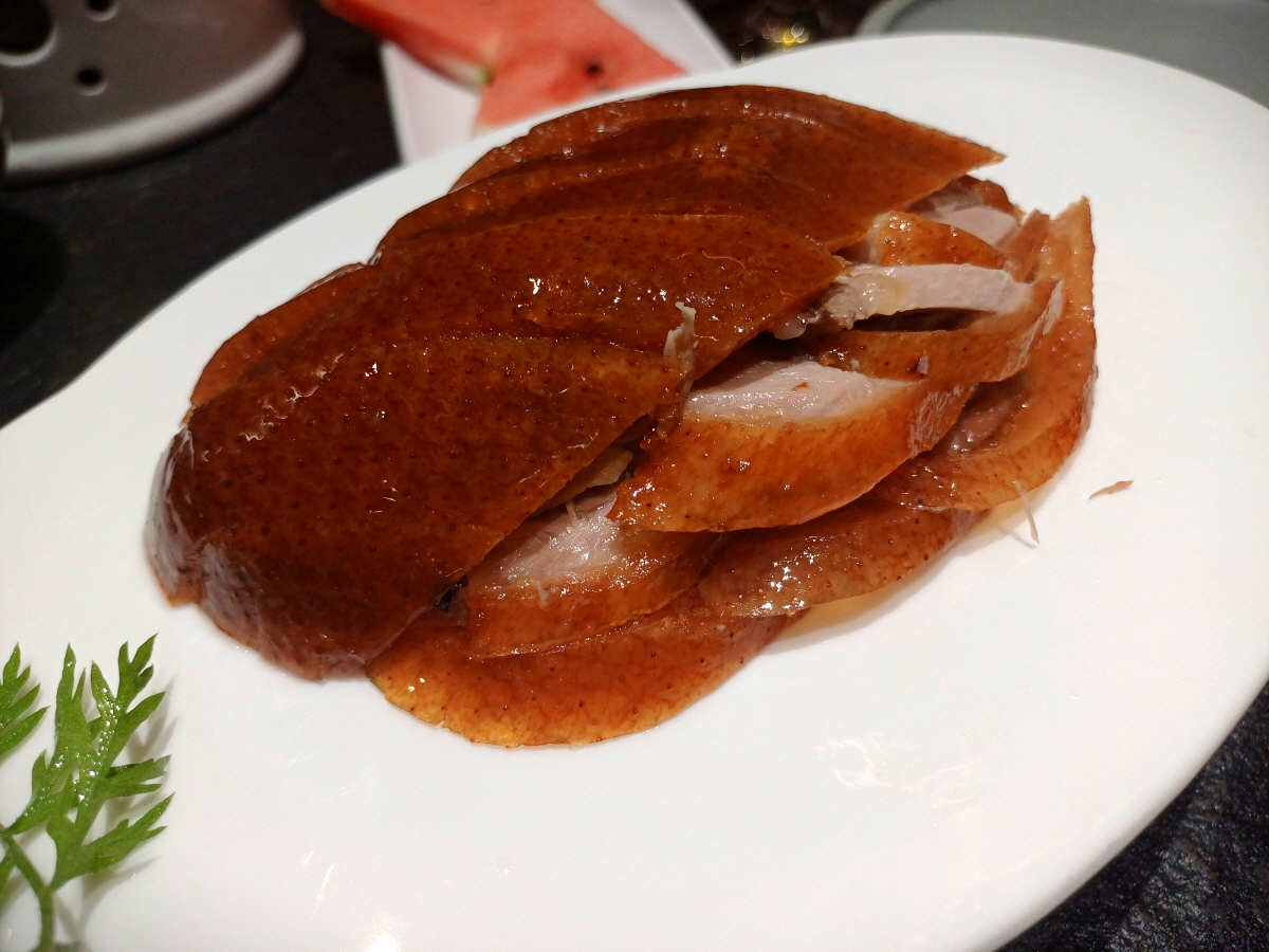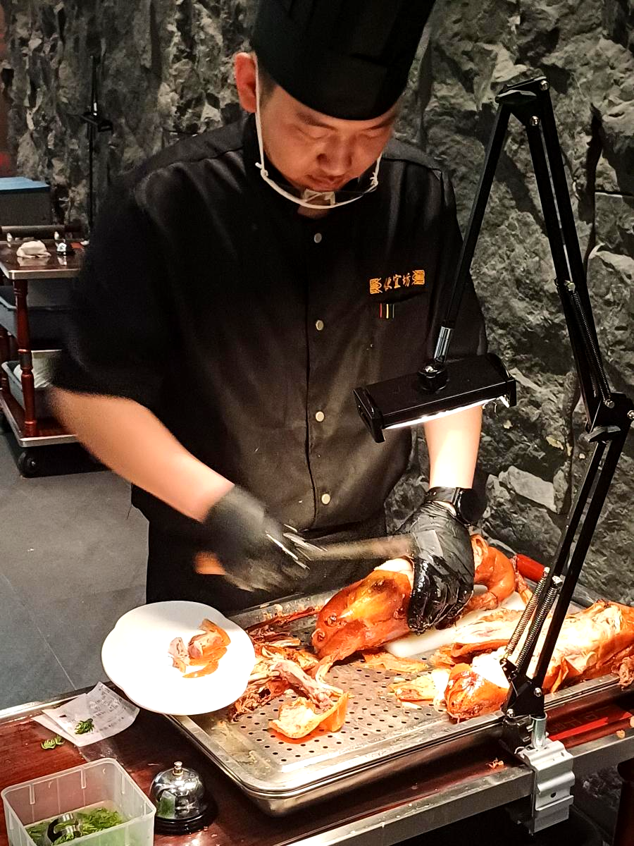 직원 한 명이 북경오리가 올라가 있는 수레를 끌고 오더니 바로 눈앞에서 북경오리를 썰어줬다. 언제나 봐도 재미있는 장면이라 집중해서 구경을 해줬다.
