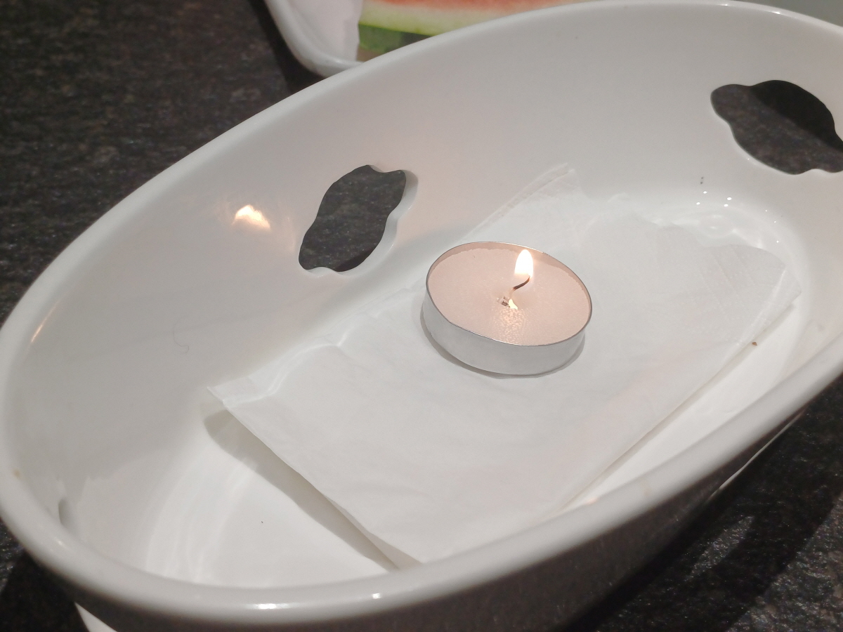 썰은 북경오리가 식지 않도록 그릇 아래에 초를 붙여주고,