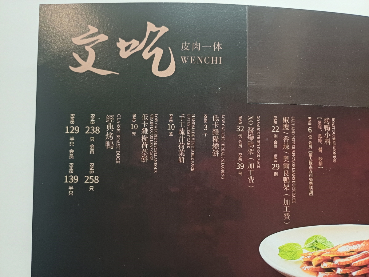 일단 메인 요리인 북경오리를 주문했다. 한 마리는 258위안, 반마리는 139위안이었으며, 곁들여 먹는 재료는 인당 6위안이었다. 세 가족이라 반마리만 주문을 했다.