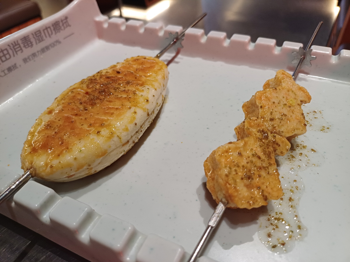 얼마 지나지 않아서 주문한 꼬치들이 나왔는데, 양꼬치의 비주얼이 정말 아름다웠다. 꼬치의 고기와 비계의 비율, 배열이 모두 비슷했다.