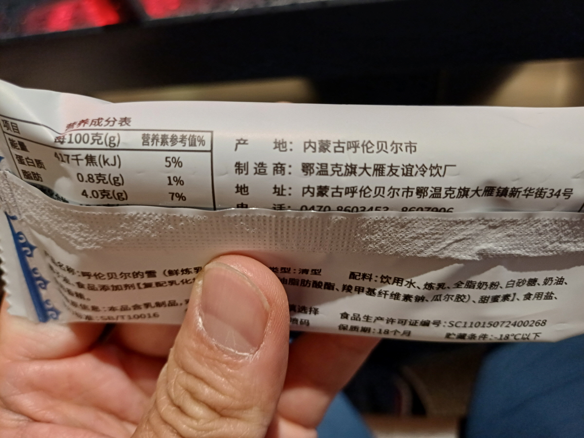 아이스크림의 산지를 살펴보니 후룬베이얼로 적혀 있는데, 아이스크림을 다 먹고 난 뒤 나무 손잡이에는 '우리 사장은 후룬베이얼 초원에서 왔습니다'라고 적혀 있었다. 맛은 한국의 서주 아이스 밀크맛 아이스크림과 비슷했다.