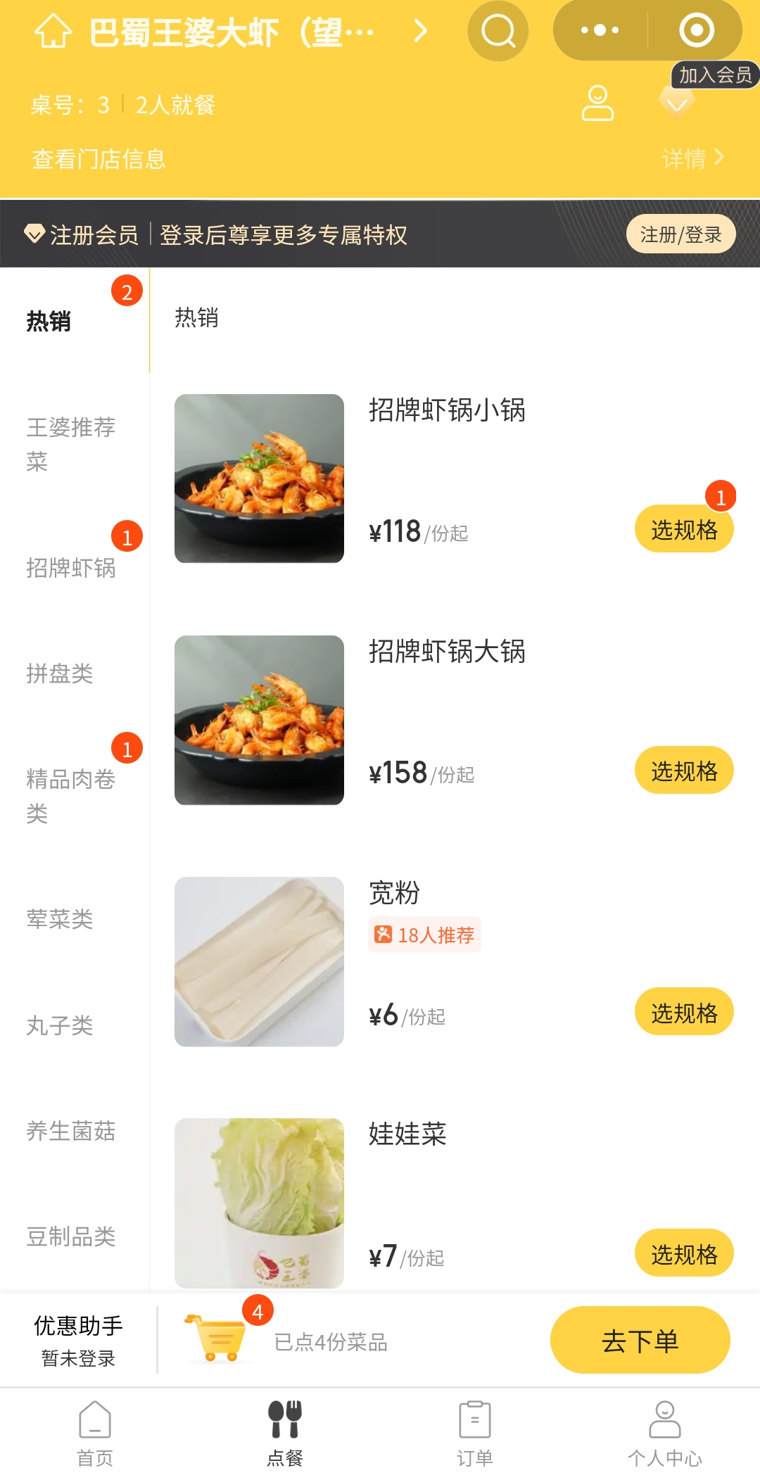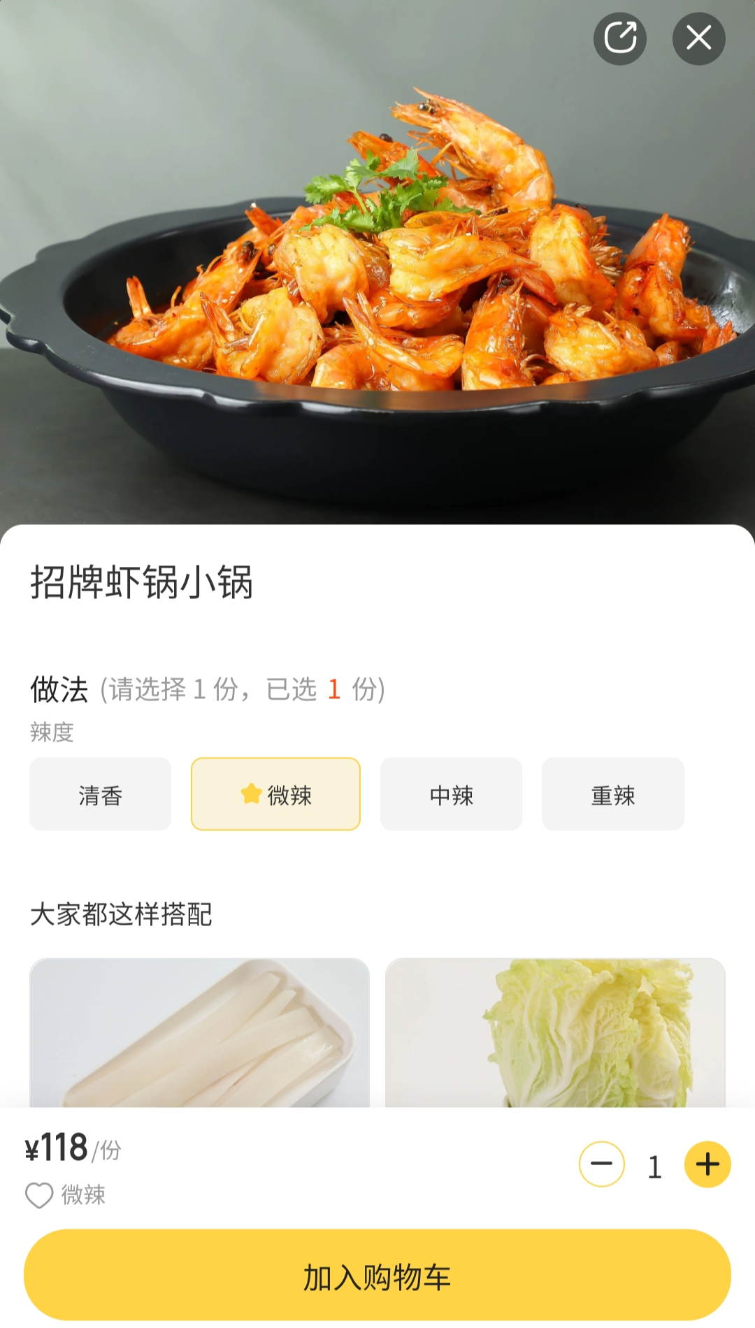 주문은 테이블에 붙어 있는 QR코드를 스캔하여 진행했고, 새우훠궈 작은 사이즈와 소고기 한 판을 주문했다. 매운 정도는 4단계로 구분되어 있었는데 2단계인 미라(微辣/ wēilà)를 선택했다. 소스와 셀프바 이용료를 인당 8위안을 받는 것이 조금 특이했다.