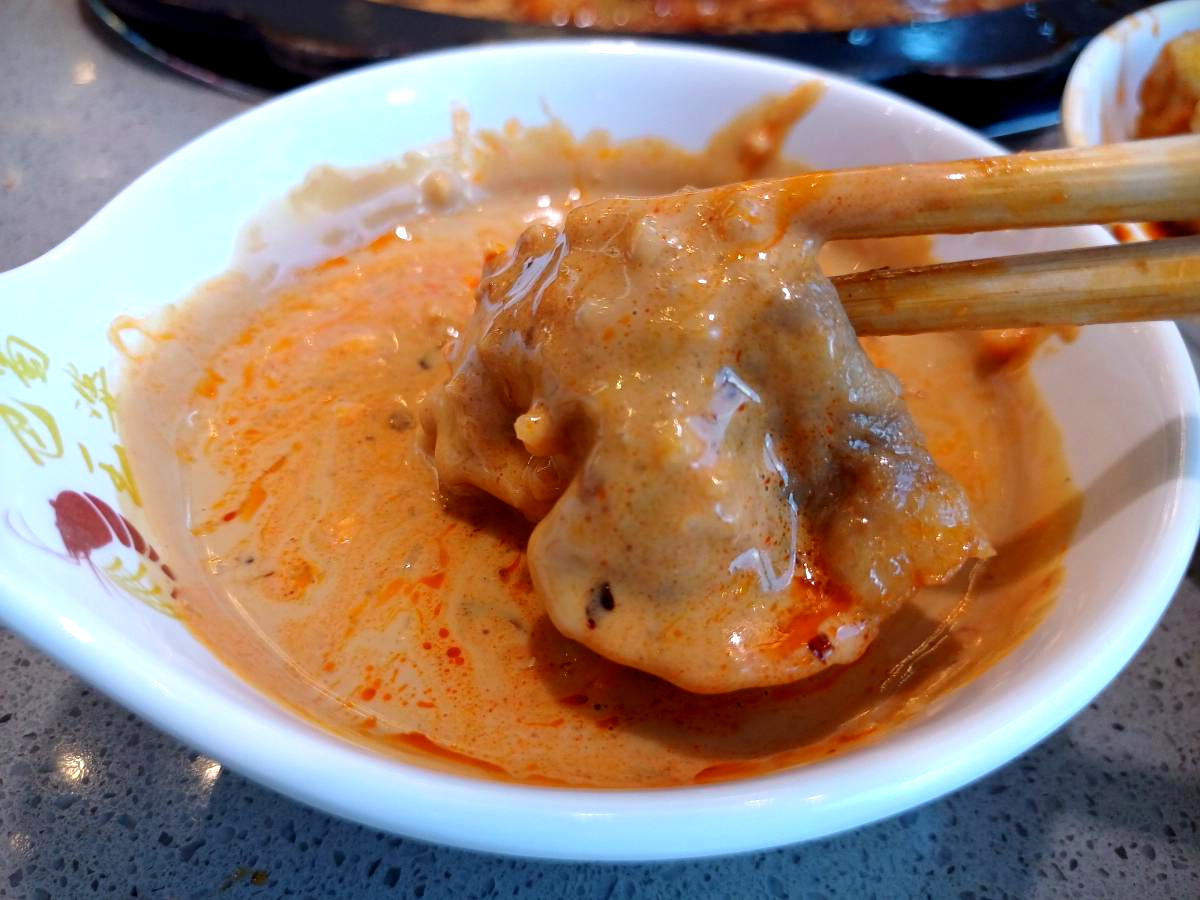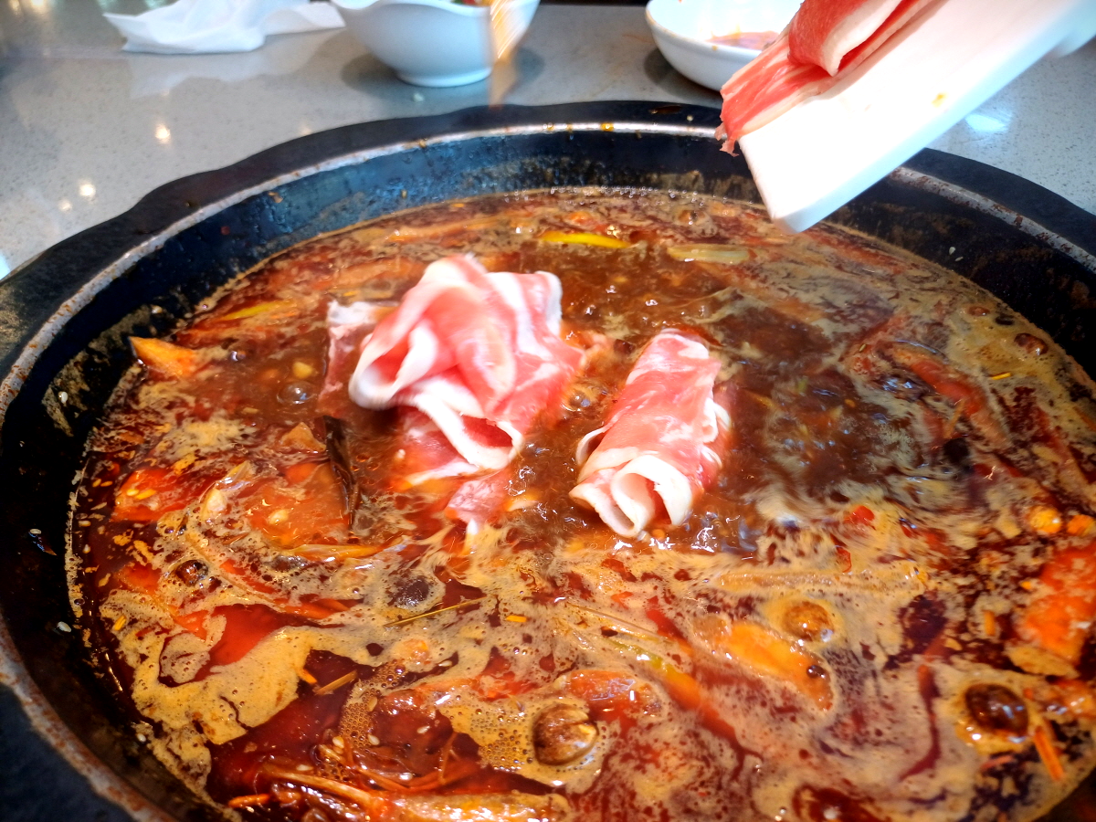새우를 다 먹은 뒤 직원을 호출해서 육수를 추가해 달라고 요청하면 냄비에 하얀색의 육수를 가득 부어주는데, 육수가 끓기 시작하면 소고기를 넣어 일반 훠궈처럼 즐기면 된다.