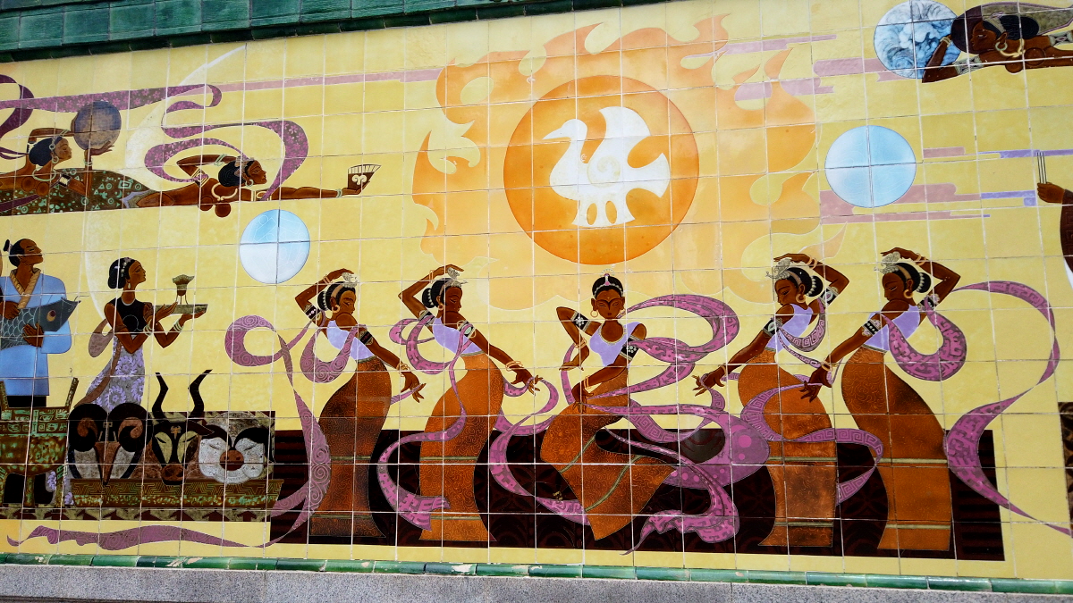 더 가까이 가서 자세히 살펴보니 작은 타일을 붙여 만든 벽화였다. 벽화의 사람 피부색이 검은색인 것이 다소 특이했다. 햇볕을 너무 봐서 얼굴이 다 탄 것인가??