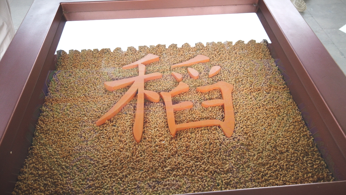 가운데 정자에 여러 곡식이 담겨있는데, 가장 위에는 벼가 담겨 있다. 농사의 근본은 역시 쌀이다.