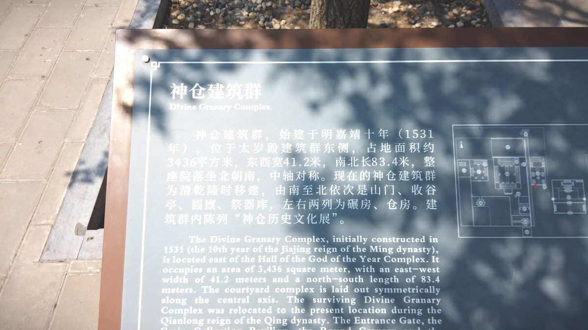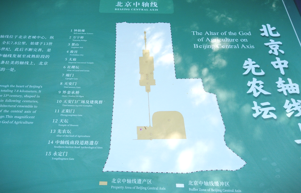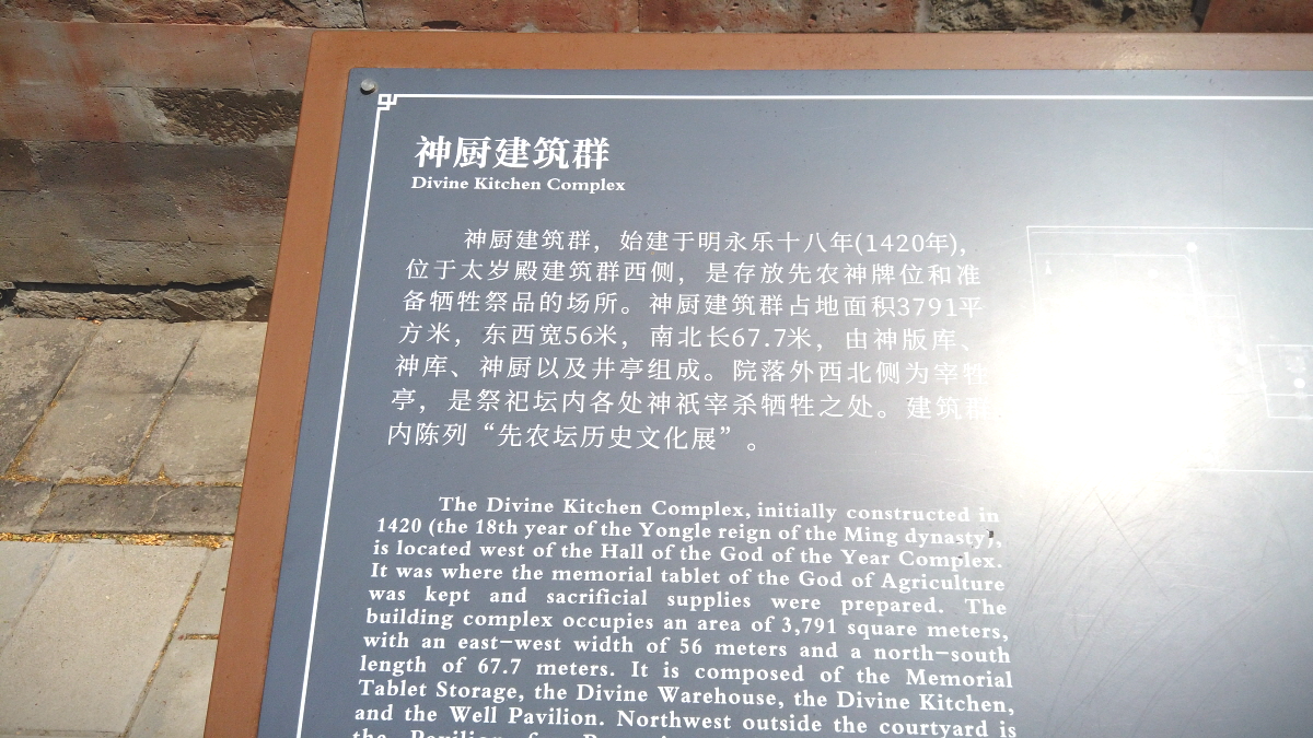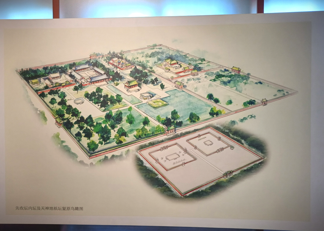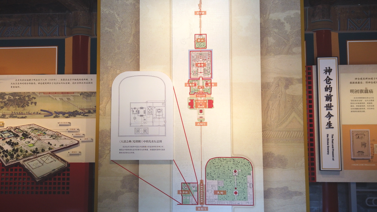 가장 안쪽 건물에는 다섯 개의 곡식이 담긴 제단이 있었으며, 다른 건물에는 당시 곡식을 관리하던 모습들이 재현되어 있었고, 베이징의 중추선에 대한 전시도 또 볼 수 있었다.